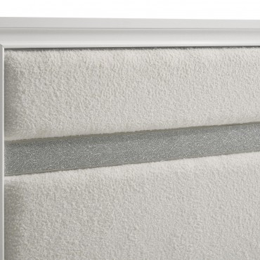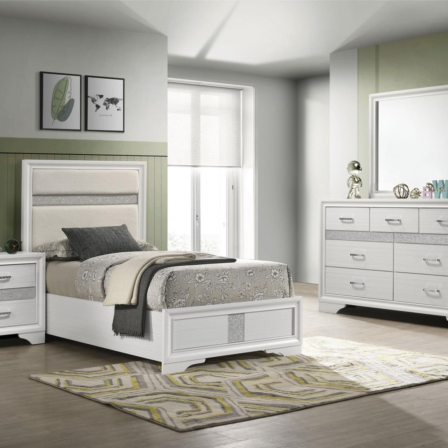 Encourage a glam vibe in your refined bedroom with a modern four-piece bedroom set. Centering on a stylish bed with an upholstered headboard and low footboard, the set includes a two-drawer nightstand for easy bedside storage and display space. A seven drawer dresser and mirror complete the set, adding diamond-like trim across its face that catches the light and offers a sophisticated touch. Bracket feet add a touch of dimensionality and movement to each piece and jewel-like bar pulls add intriguing sparkle. A cool white finish is textured, while white finish trim is smooth, creating a touch of textural contrast that add engaging style.