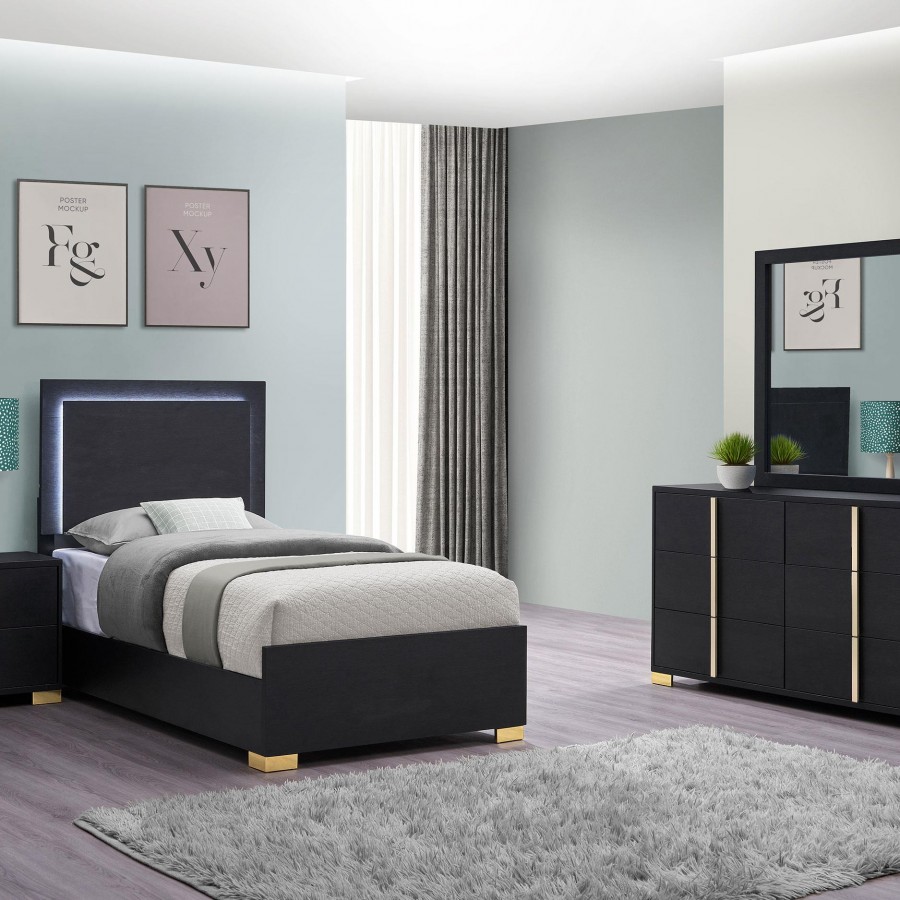 Gleaming gold accents create a sense of richness and elegance for a contemporary bedroom set. In a black finish that's crisp and timeless, the set offers a stylish, modern bed complete with a squared headboard and low footboard, offering an airy feel in your bedroom. The headboard is equipped with built-in LED lighting operated by touch switches on the left and right sides, within easy reach from either side of the bed. The mood lighting creates a lovely ambiance while accent pieces in the set offer plenty of storage. The dresser is topped with a framed mirror, great for opening your space and providing a great spot for choosing jewelry or a tie in the morning.