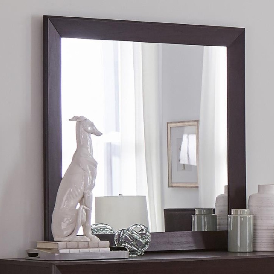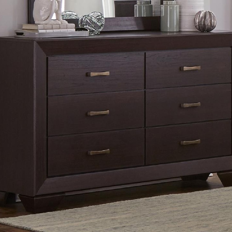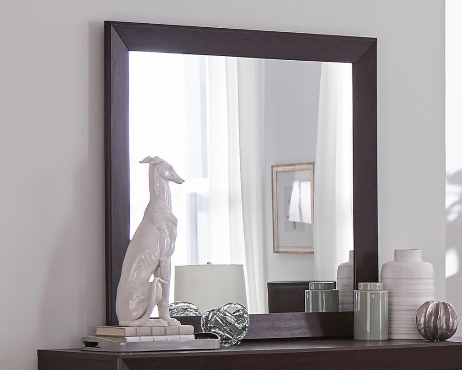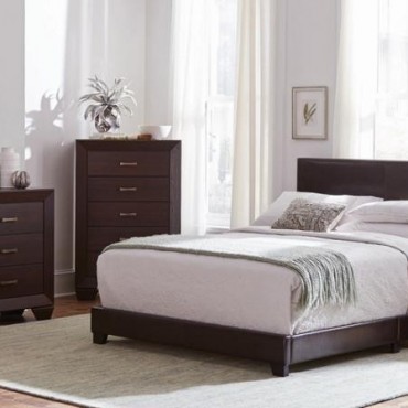 Mid-century modern-inspired, this sleek four piece bedroom set is transitional and versatile. Upholstered in brown leatherette, the bed frame features decorative stitching and block tapered legs. Complete with a nightstand, dresser, and mirror, this set warms up any contemporary motif with style. The six-drawer dresser and two-drawer nightstand feature contrast black recessed grooves. Open up a space with the smooth edges and charm of deep metallic hardware.