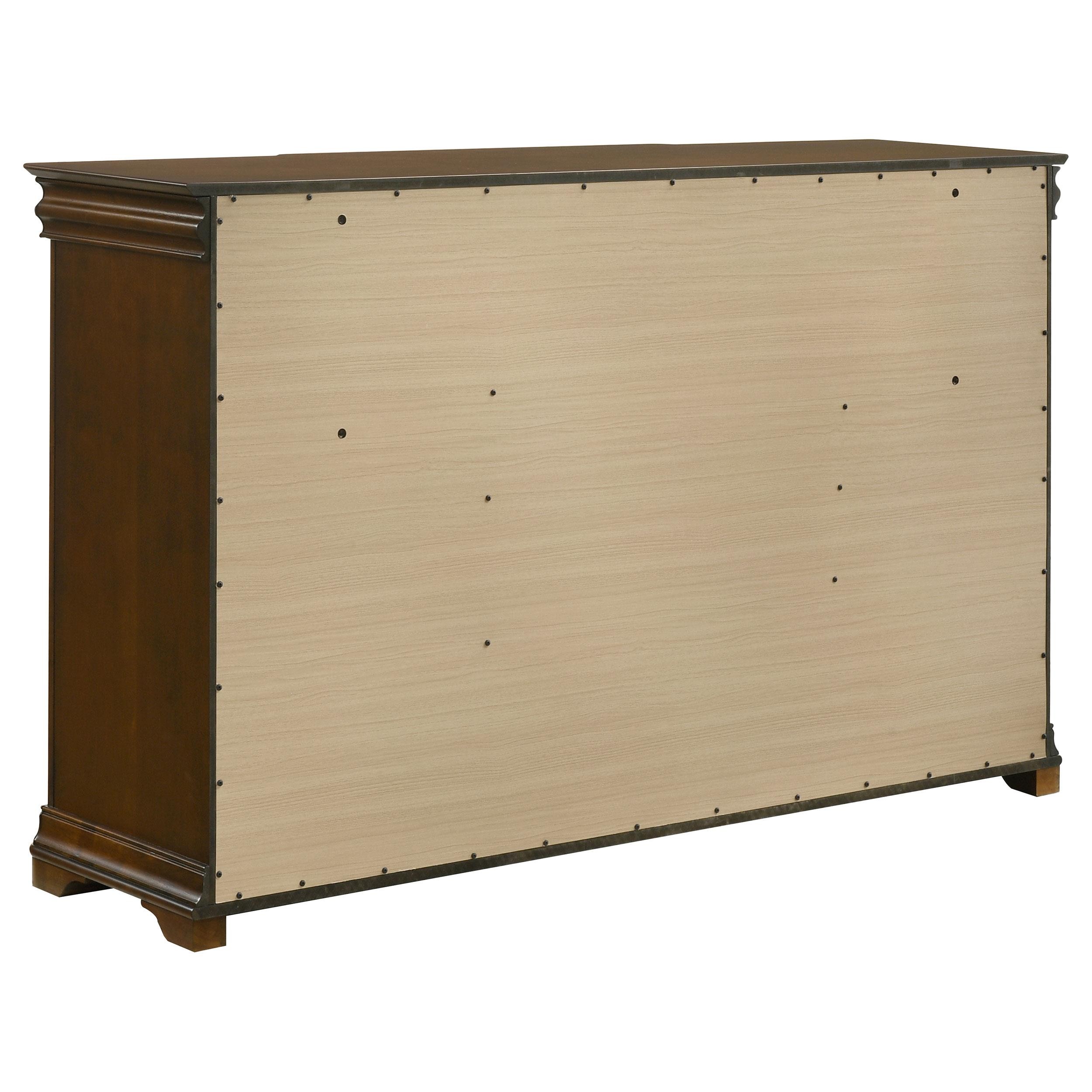This bedroom set brings graceful elegance into the present with updated Louis Philippe styling. Each piece features crown molding, antique nickel ring pulls, and a warm brown cherry finish that radiates richness and charm. The bed softens the look with a cream upholstered headboard framed by sculpted rails and cutaway corners. Crafted from solid rubberwood, cherry veneer, and padded fabric, this collection blends timeless detail with modern comfort.