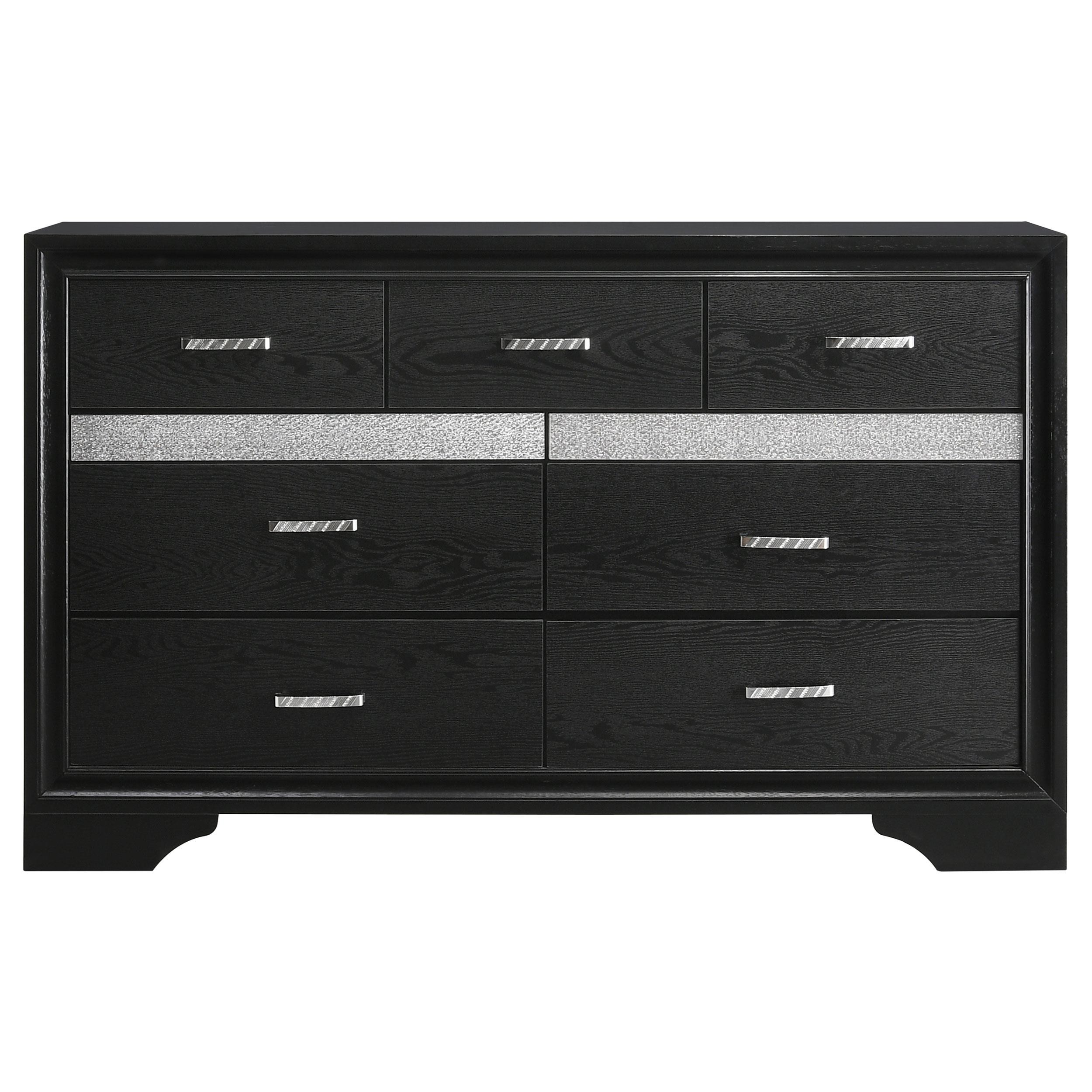 Glittering trim and a black finish create a sense of sophistication for a four-piece modern bedroom set. Designed to make a statement, the set focuses on a bed that boasts a crisp, clean-lined silhouette that pairs a rectangular headboard with padded black upholstery. Glittering diamond-like trim adorns the head and footboards of the bed and makes a statement on both the nightstand and dresser. Drawers are accentuated with jewelry inspired bar pulls that add to a gleaming presentation. Bracket feet complete the look of each piece in this set, offering a touch of timeless character and subtle movement.