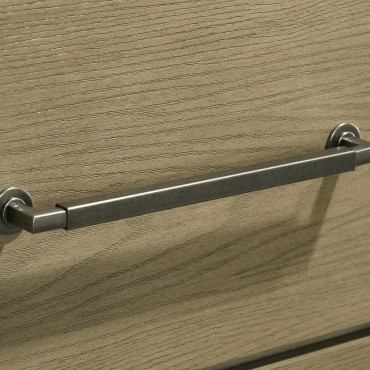 Bring natural character and clean structure into your bedroom with this transitional suite, defined by a slatted headboard, refined trim, and antique nickel accents. A warm vineyard oak finish highlights the embossed oak grain across the bed and coordinating case pieces. Smooth-gliding drawers offer generous storage with heavy-duty metal ball bearing extension slides for lasting durability. Crafted from rubberwood and engineered wood veneer, this collection balances modern practicality with timeless charm.