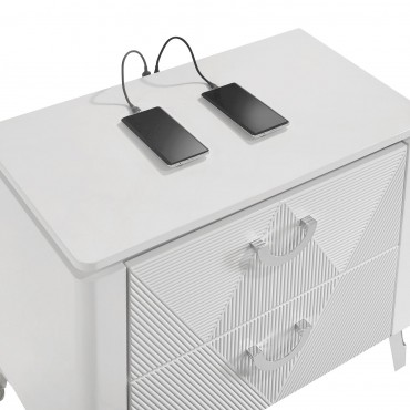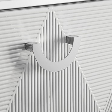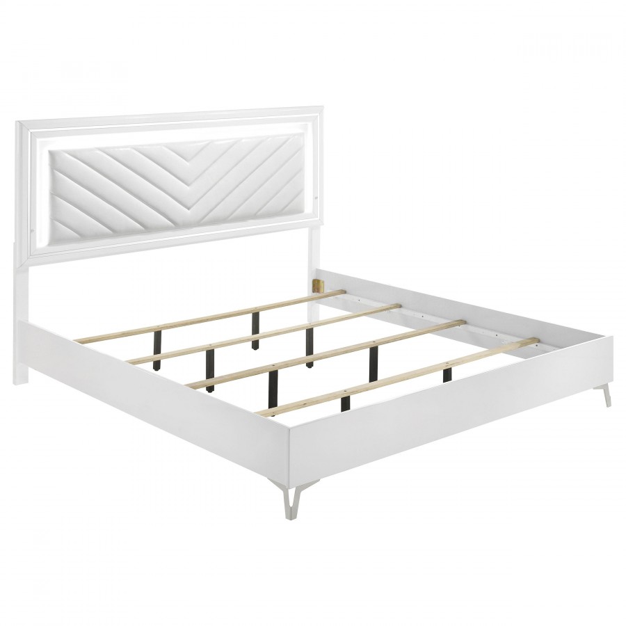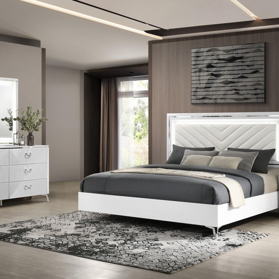 Crisp white high gloss and sculptural textures define this modern bedroom set, blending sleek surfaces with dimensional details. Geometric drawer fronts feature ribbed V-patterns and polished chrome pulls, while all drawers glide smoothly on 45mm metal extension hardware. The headboard stands out with chevron-tufted white faux leather framed by soft white LED trim. Completing the ensemble, a coordinating LED dresser mirror adds ambient glow and polished symmetry to the space. Elevated on chrome legs, this set is a showcase of contemporary form and function.