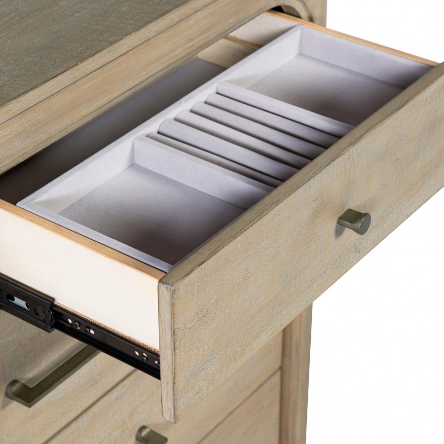 With sculptural elegance and quiet drama, this bedroom set centers around a stunning canopy bed framed by arched posts and softened edges. A tailored, upholstered headboard adds comfort and contrast, while coordinating storage pieces echo the same graceful curves and thoughtful detailing. Felt-lined drawers, hidden compartments, and smooth-gliding function offer both luxury and utility. Crafted from mahogany, engineered wood, mango veneer, and fabric, the set brings lasting poise and presence to the bedroom.
