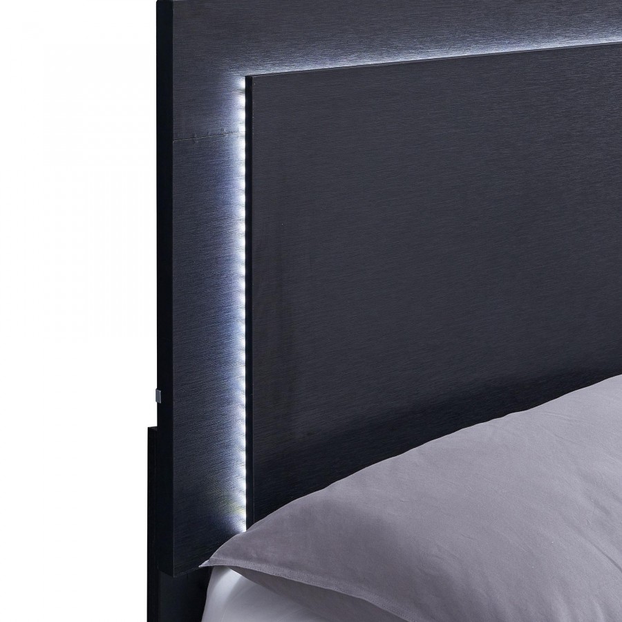 Gleaming gold accents create a sense of richness and elegance for a contemporary bedroom set. In a black finish that's crisp and timeless, the set offers a stylish, modern bed complete with a squared headboard and low footboard, offering an airy feel in your bedroom. The headboard is equipped with built-in LED lighting operated by touch switches on the left and right sides, within easy reach from either side of the bed. The mood lighting creates a lovely ambiance while accent pieces in the set offer plenty of storage. The dresser is topped with a framed mirror, great for opening your space and providing a great spot for choosing jewelry or a tie in the morning.