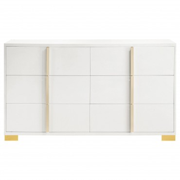 Cool white and warm gold create a compelling, modern ambiance for a stylish contemporary bedroom set. Centered on clean-lined silhouettes, the set features a modern bed complete with a squared headboard with built-in LED lighting that creates the right mood for relaxing evenings. The light is operated with a touch switch on each side of the headboard, assuring it's in easy reach. Storage pieces add roomy drawers with vertical gold pulls, and the dresser is topped in a framed mirror that adds to the airy feel of this set. Bracket feet complete the set, offering reliable stability and just the right hint of modern glam sophistication.