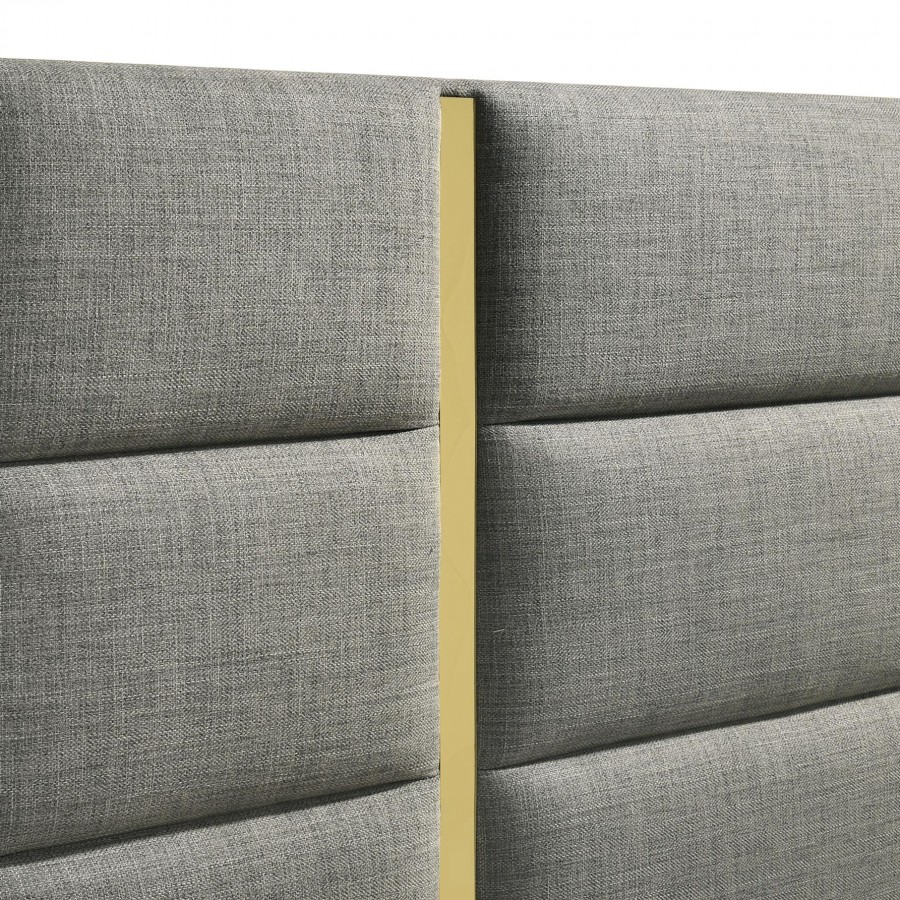 This contemporary bedroom set channels high-end Italian style through sleek geometry and luxe material finishes. Each piece is accented with polished gold details that bring sculptural contrast to clean, modern lines. Case goods are wrapped in eco-friendly PET thermoplastic for a glossy, durable, and easy-to-clean surface, while the bed features soft woven upholstery with bold gold acrylic trim. A refined blend of form, function, and everyday resilience.