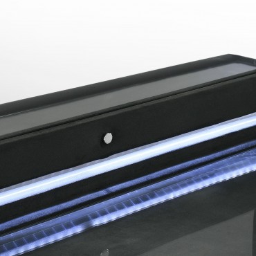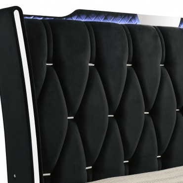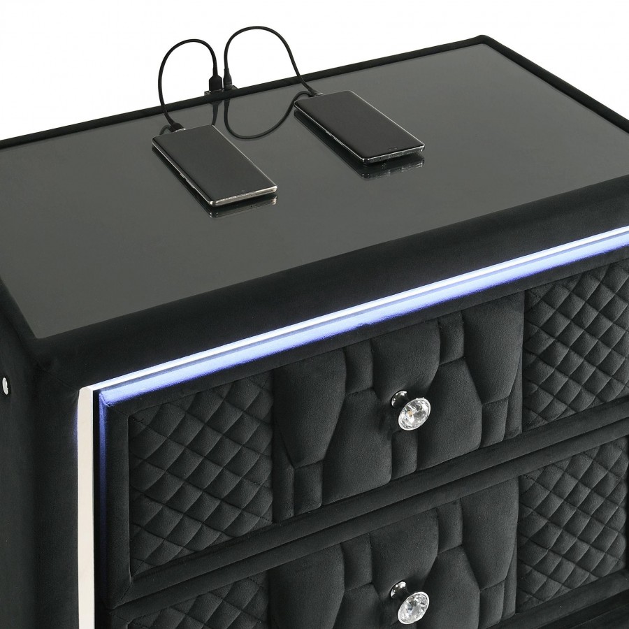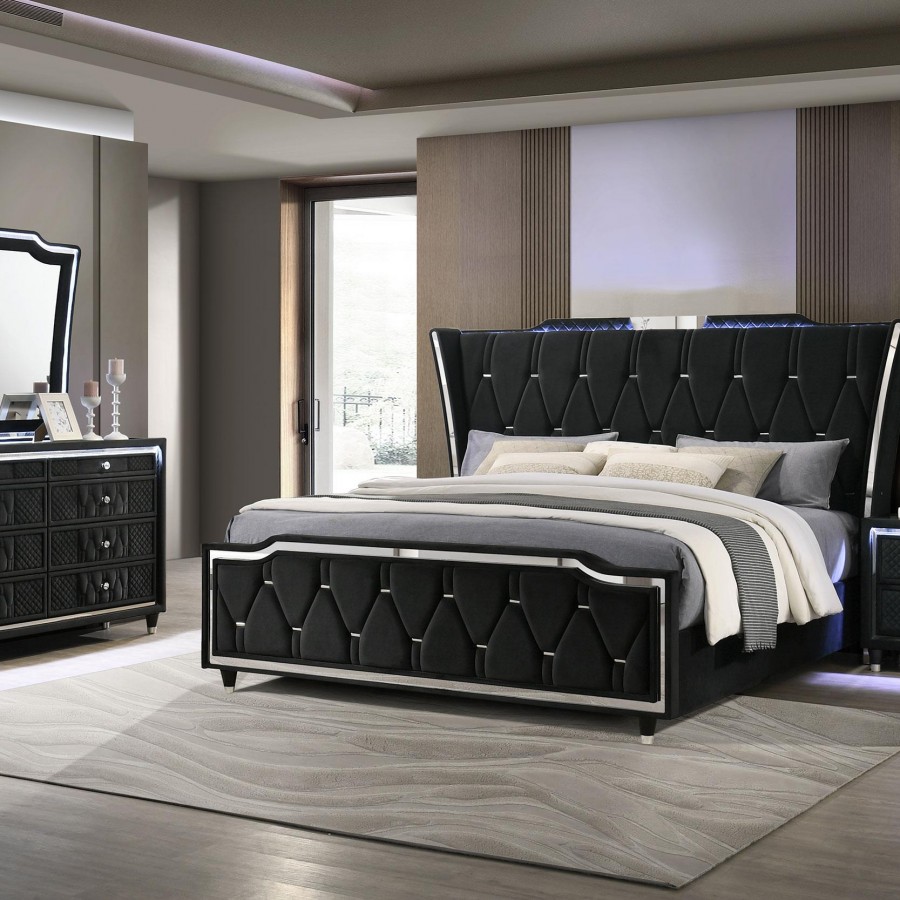 Unite form and function in this bedroom set, where sculpted glamour meets modern refinement. Each piece is wrapped in a black velvet with quilted textures, crystal knobs, and reflective acrylic accents. The dresser features a clear tempered glass top and LED case lighting without the fireplace insert. Combined with the LED wingback bed, USB nightstand, and tri-panel mirror, the set delivers soft sophistication with everyday practicality.