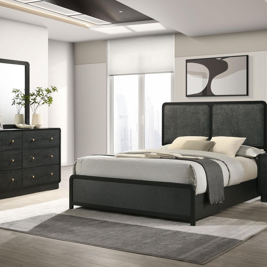 Reimagine your bedroom entirely with the sophistication of a modern bedroom set. It focuses on a chic upholstered bed that features a pair of padded panels with charcoal fabric that creates a soft, inviting presence that's perfect for lounging while maintaining a refined look. Storage pieces add ample space for organization. The dresser includes a mirror that lightens the look and provides reflectivity and a place for beauty rituals. A black finish is paired with old finish hardware, creating a touch of glam allure perfect for a sophisticated bedroom.