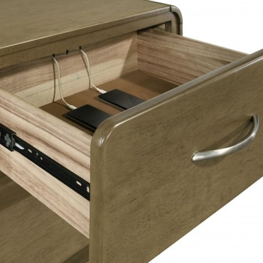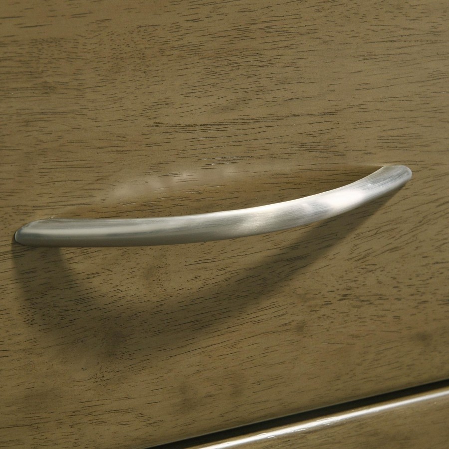 Transform your bedroom into a stylish and serene retreat with this modern bedroom set. The warm nutmeg wood finish across all pieces creates a cohesive and inviting atmosphere, while the soft, beige upholstered headboard on the bed adds a touch of luxury. The case pieces feature smooth metal extension glides for effortless functionality, and the rounded corners on all pieces contribute to a sleek, contemporary look. Matte nickel hardware provides a refined accent that complements the overall aesthetic. Crafted from solid rubberwood and engineered wood, this set combines timeless design with everyday practicality.