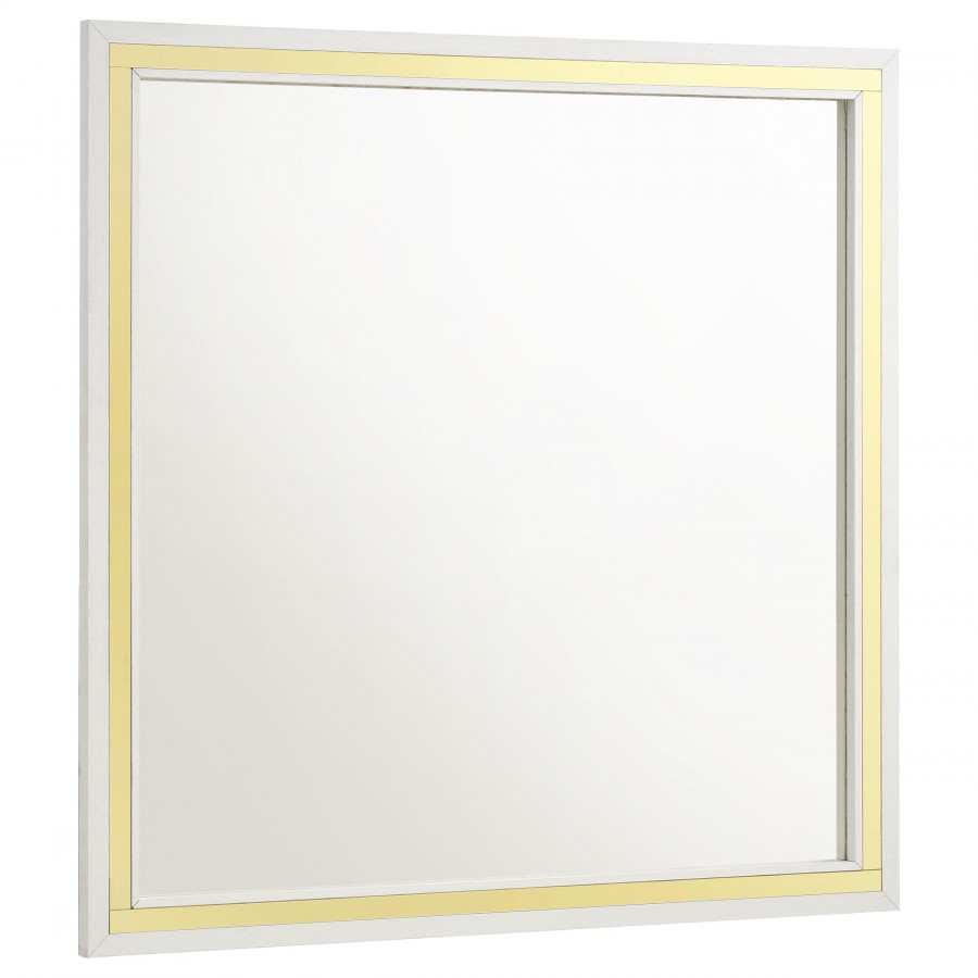 Effortlessly blending inviting softness and timeless sophistication, this four-piece modern bedroom set creates a rich but inviting ambiance. It centers on a stylish upholstered bed that pairs beige upholstery with a fluted look, creating impressive texture and dimensionality. Its on-trend silhouette encourages an open, airy feeling, complete with understated rails and footboard. The set includes a two-drawer nightstand and six-drawer dresser and mirror combination, creating a stylish set that brims with elegance. The cases features a bright white finish, while each piece is trimmed in gold, offering gleaming warmth and sophistication.