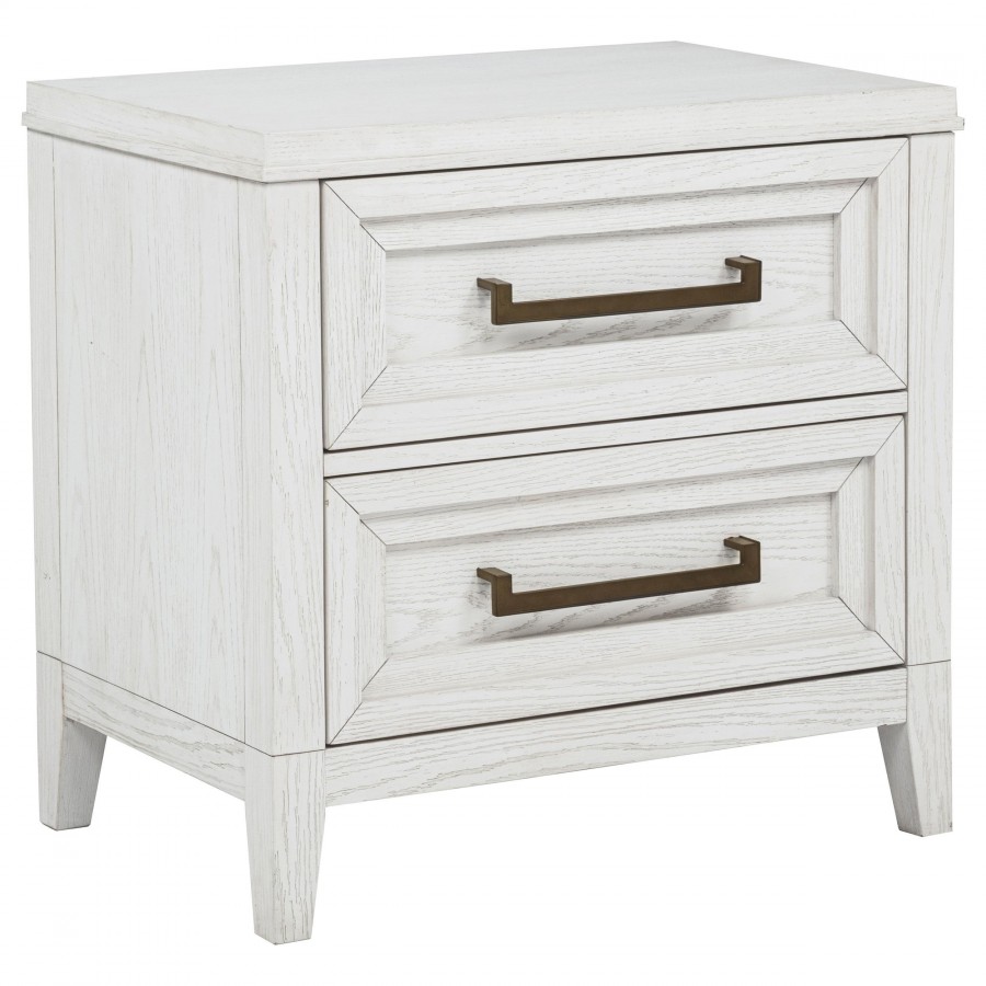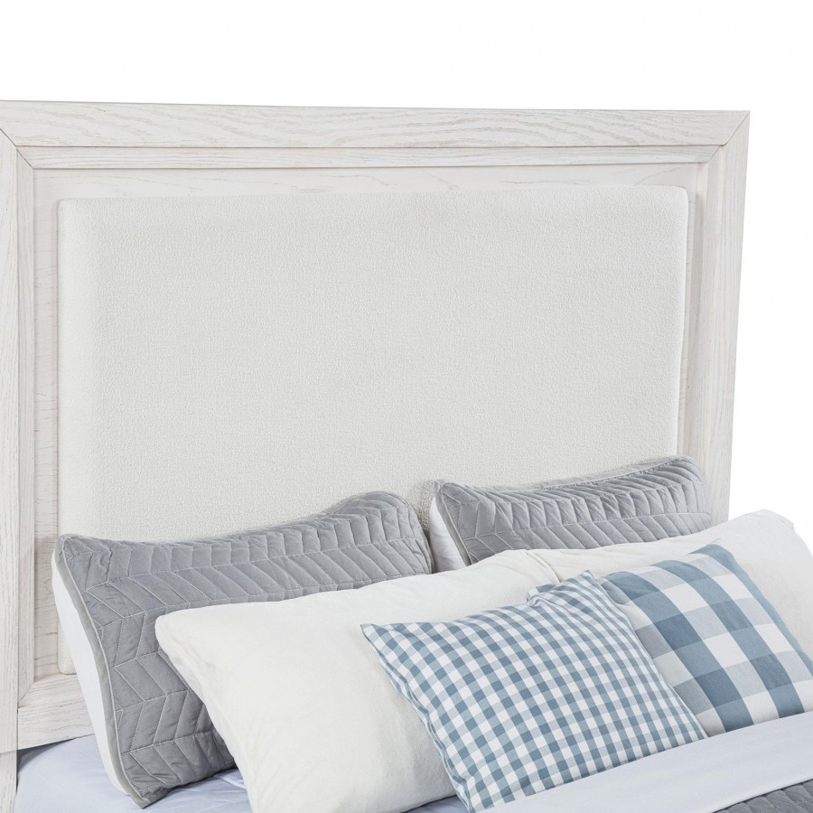 Embrace the fresh, contemporary style of a four-piece bedroom set. A distressed white finish highlights wood grain texture, while clean lines define the set with refined, inviting ambiance. The bed pairs a tall headboard and low footboard for an open profile adding to the modern appeal of this set. It includes a six-drawer dresser with a framed mirror, creating ample storage for clothing and linens. A two-drawer nightstand adds bedside storage and provides the perfect spot for a reading lamp or a vase of fresh flowers.