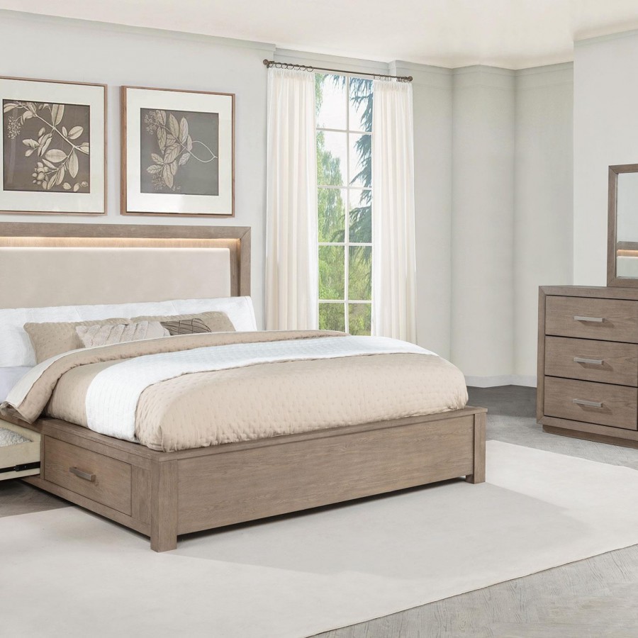 Prioritize chic storage with this four-piece modern bedroom set that includes built-in LED lighting in both the headboard and one-drawer nightstand. A light barley brown wood grain finish pairs with beige upholstery, creating a neutral color palette to enhance your linens and surrounding decor. The set centers on a platform-style bed with four underbed drawers for easy storage and an LED headboard with an upholstered panel that adds cozy foam cushioning for comfortable lounging. The nightstand is a C-shaped design with one drawer, a large shelf space and LED lighting that adds soothing ambiance to your bedroom setting. The dresser and framed mirror combo completes the look, offering six drawers with chrome finish bar pulls that complement perfectly.