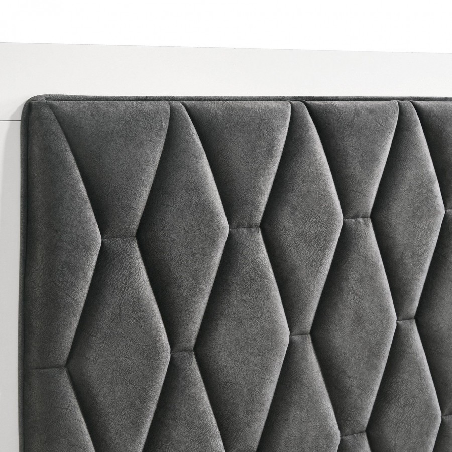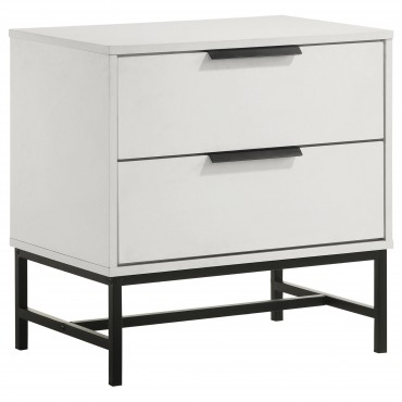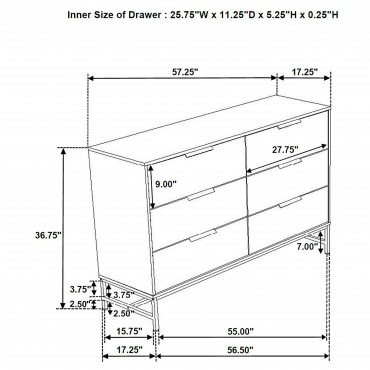 Reimagine your bedroom retreat with the crisp, clean appeal of a modern four-piece bedroom set. Its clean, precise style is emphasized with sleek silhouettes and a bright white finish. The set centers on a chic bed with a tall headboard and low footboard, offering fresh style with geometric tufting in dark gray padded upholstery. Black finish legs complete the bed and bring cohesive style to the set, matching bases and hardware on the dresser and nightstand. The dresser offers plenty of storage and includes a framed mirror on top, adding bright reflectivity to your bedroom ensemble.
