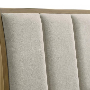 Create a cohesive and inviting space with this four-piece bedroom set, blending transitional style with modern highlights. The set includes a bed, nightstand, dresser, and mirror, each finished in natural pine, exuding warmth and sophistication. The bed features a vertical channeled upholstered headboard, adding a touch of luxury to your sleep space. Each piece is designed with softly curved fronts, square tapered legs, and antique nickel hardware, enhancing the set's overall elegance. This bedroom set is perfect for those seeking a balanced mix of classic and contemporary design.