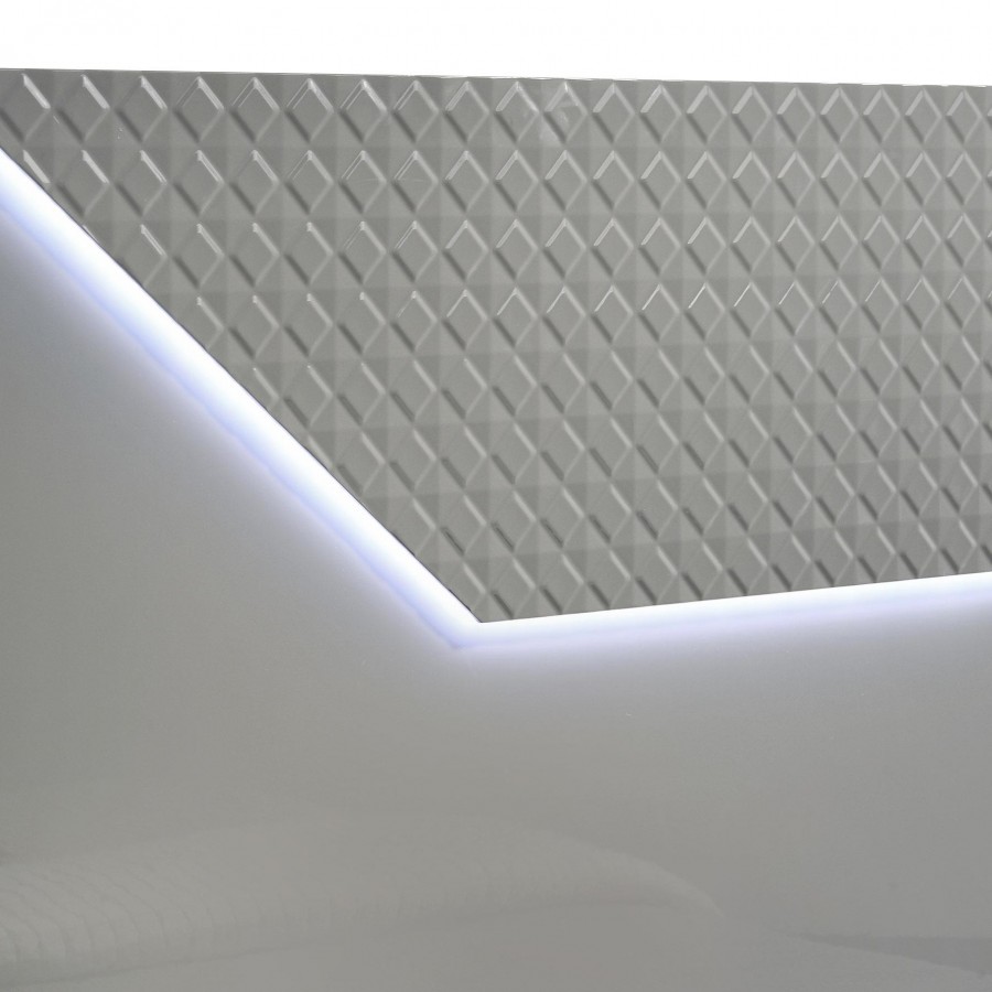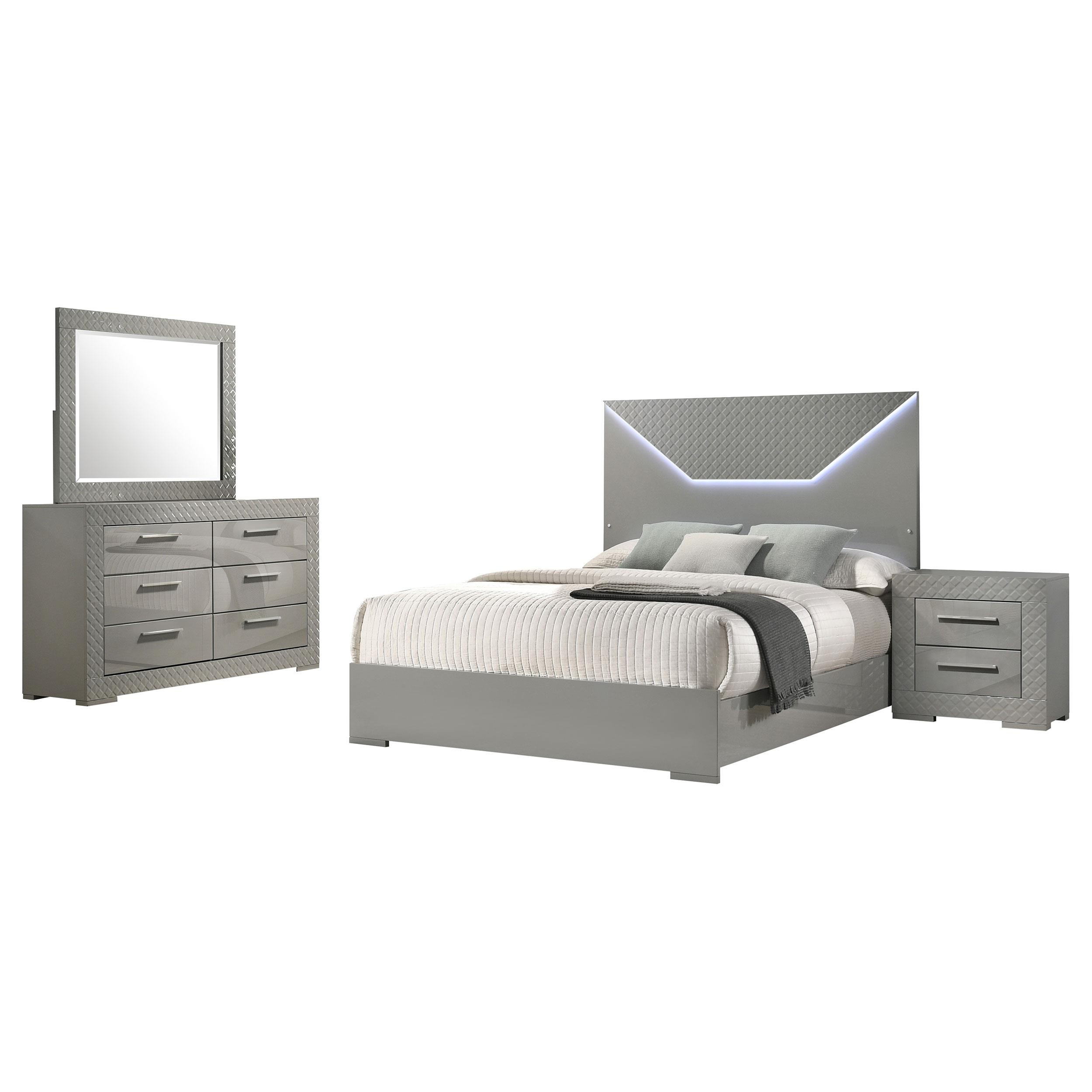 Create a cohesive and stylish look in your bedroom with this four-piece set, including a bed, nightstand, dresser, and mirror. The set features a high gloss finish and 3-dimensional diamond tile emboss, reflecting a contemporary Italian style. Each piece is crafted with quality materials and attention to detail, offering both beauty and functionality. The bed includes a touch LED light in the headboard, while the dresser and nightstand provide ample storage with felt-lined top drawers. This bedroom set is perfect for those seeking a modern and elegant aesthetic.
