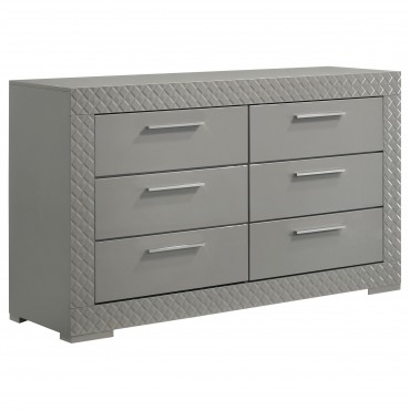 Create a cohesive and stylish look in your bedroom with this four-piece set, including a bed, nightstand, dresser, and mirror. The set features a high gloss finish and 3-dimensional diamond tile emboss, reflecting a contemporary Italian style. Each piece is crafted with quality materials and attention to detail, offering both beauty and functionality. The bed includes a touch LED light in the headboard, while the dresser and nightstand provide ample storage with felt-lined top drawers. This bedroom set is perfect for those seeking a modern and elegant aesthetic.