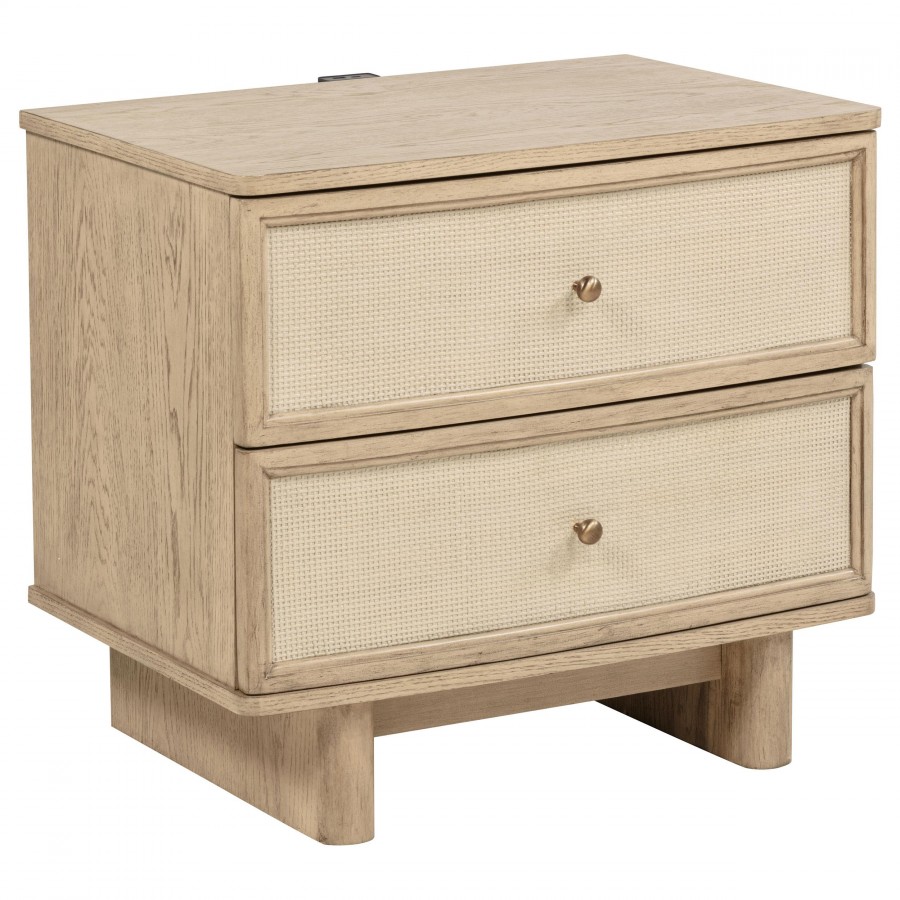 The bedroom collection combines timeless elegance with modern functionality, offering a serene and sophisticated feel for any bedroom. Featuring a platform panel system, this collection eliminates the need for a foundation, simplifying your space while maintaining sleek aesthetics. The beige oak wood finish paired with resin cane detailing and antique brass hardware exudes understated luxury, while the plush beige fabric on the headboard brings a cozy, inviting touch. Thoughtfully crafted with high-quality materials, including solid poplar and oak veneers, each piece boasts durability and style. With integrated USB and Type-C charging ports in the nightstand, this collection seamlessly blends comfort, beauty, and convenience.