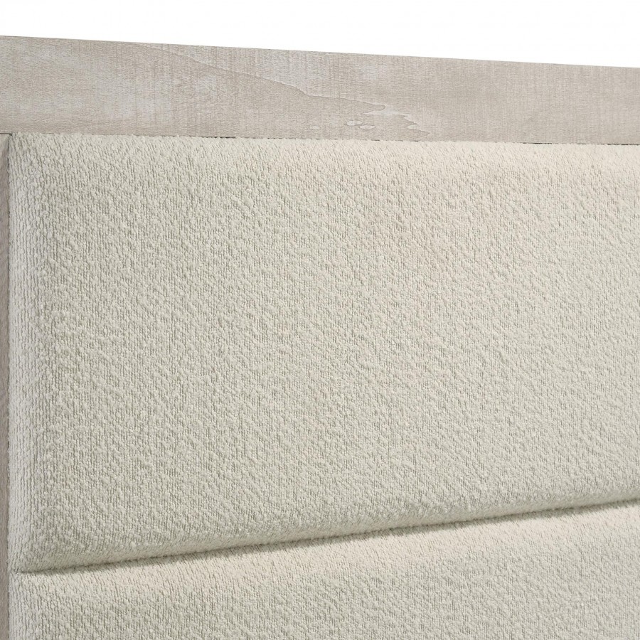 This contemporary bedroom set blends cool, modern style with rustic charm. Its Yin & Yang design pairs a rustic cream finish over engineered paper veneer with a sleek, floating bed. The headboard's padded, cream bouclé fabric adds softness, while polished nickel hardware brings shine. Crafted from rubberwood and engineered wood, drawers feature English dovetail joinery and Center metal glide for durability. This set is chic, stylish, and full of unique details.