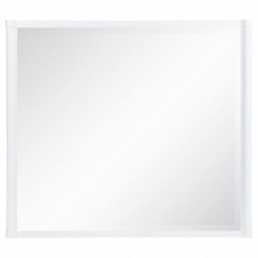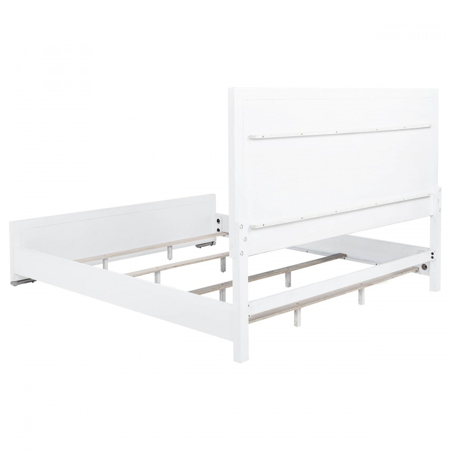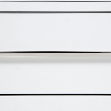 This bedroom set combines soft curvature and linear polish in a clean modern silhouette. Each piece features elongated brushed nickel pulls and subtle vertical tube accents that frame smooth white surfaces. The bed softens the look with a light grey upholstered headboard and footboard, adding contrast and comfort. Built from solid rubberwood, engineered wood, and laminate veneer, this set balances elegance with practical everyday function.