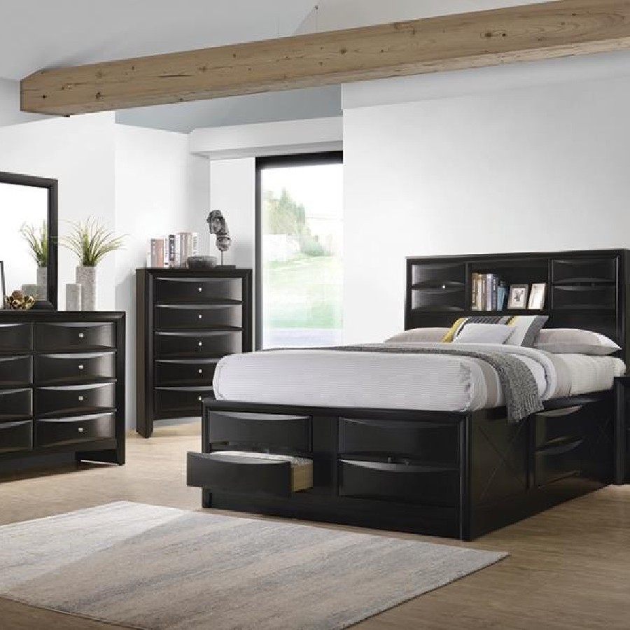 Transform your bedroom with this sophisticated storage bedroom set that combines timeless style and practical function. Finished in sleek black, the platform bed features four drawers in the footboard and hidden compartments behind drop-down doors on the headboard and side rails. The bookcase headboard includes four drawers and a center shelf for accessible storage. Complementary case pieces echo the look with chambered drawer fronts and brushed nickel hardware, creating a refined and cohesive space.