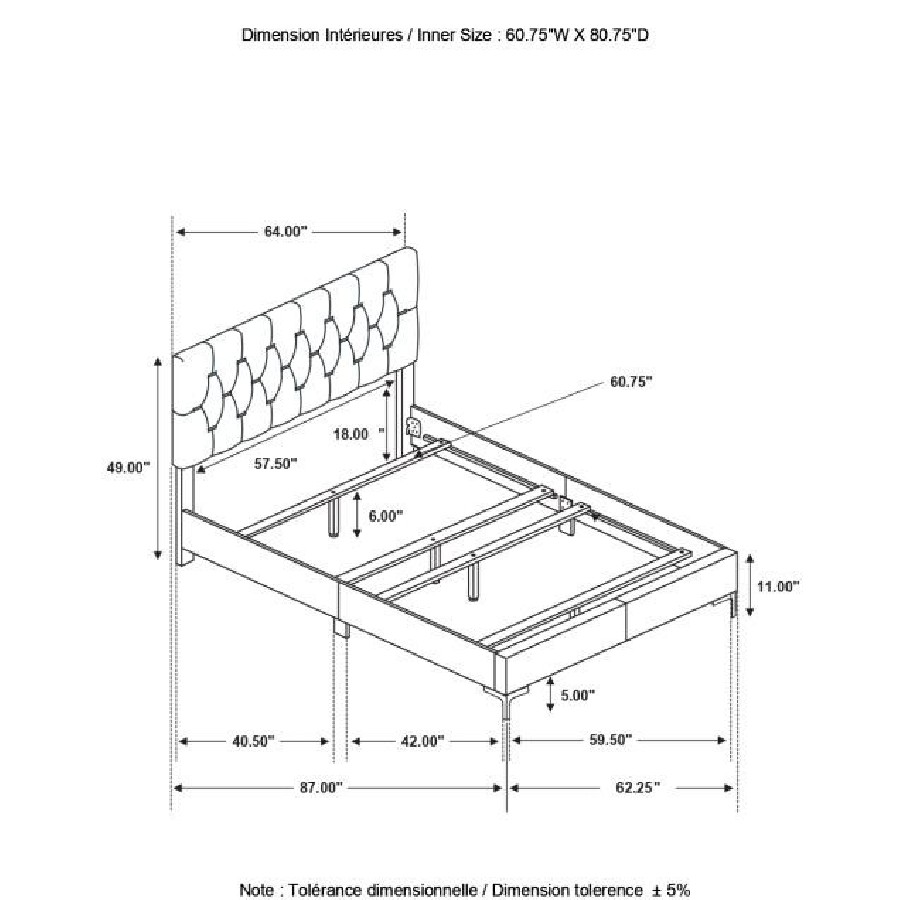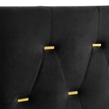 Transform your bedroom into a sophisticated retreat with this modern glam bedroom set. An upholstered bed with a diamond tufted headboard creates a cozy resting place. The smooth, black finish of the two-drawer nightstand and six-drawer dresser lends a chic and clean aesthetic, contrasted only by the gold finished hardware, stylish bracket legs, and bar sized buttons along the headboard. Spacious drawers contain and organize all your garments and linens. A tall, rectangular mirror with a black frame offers a final touch, creating a stylish dressing area.
