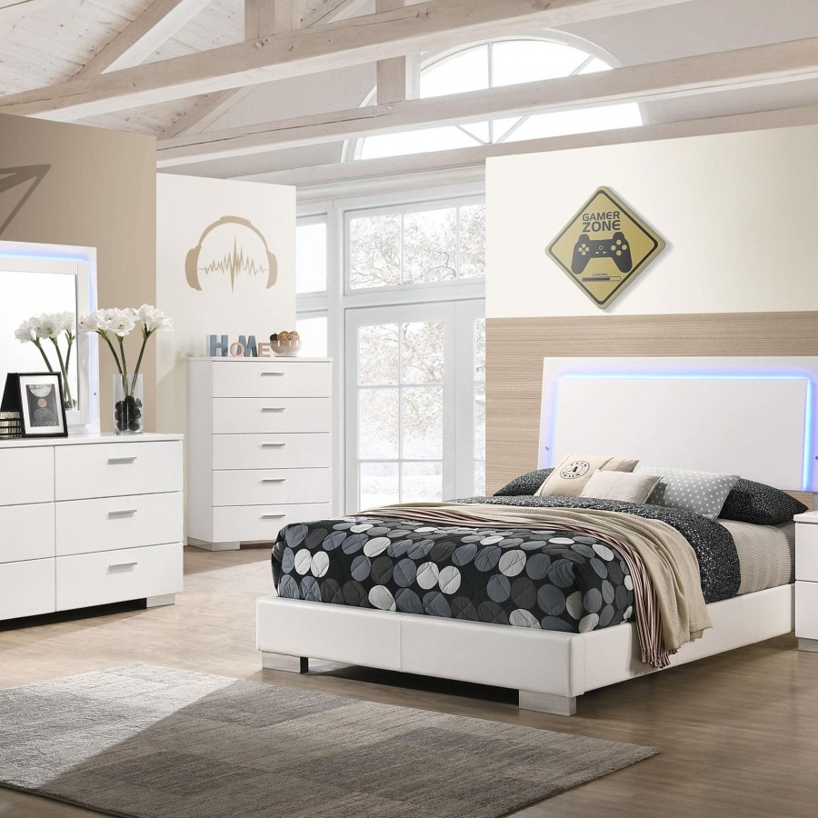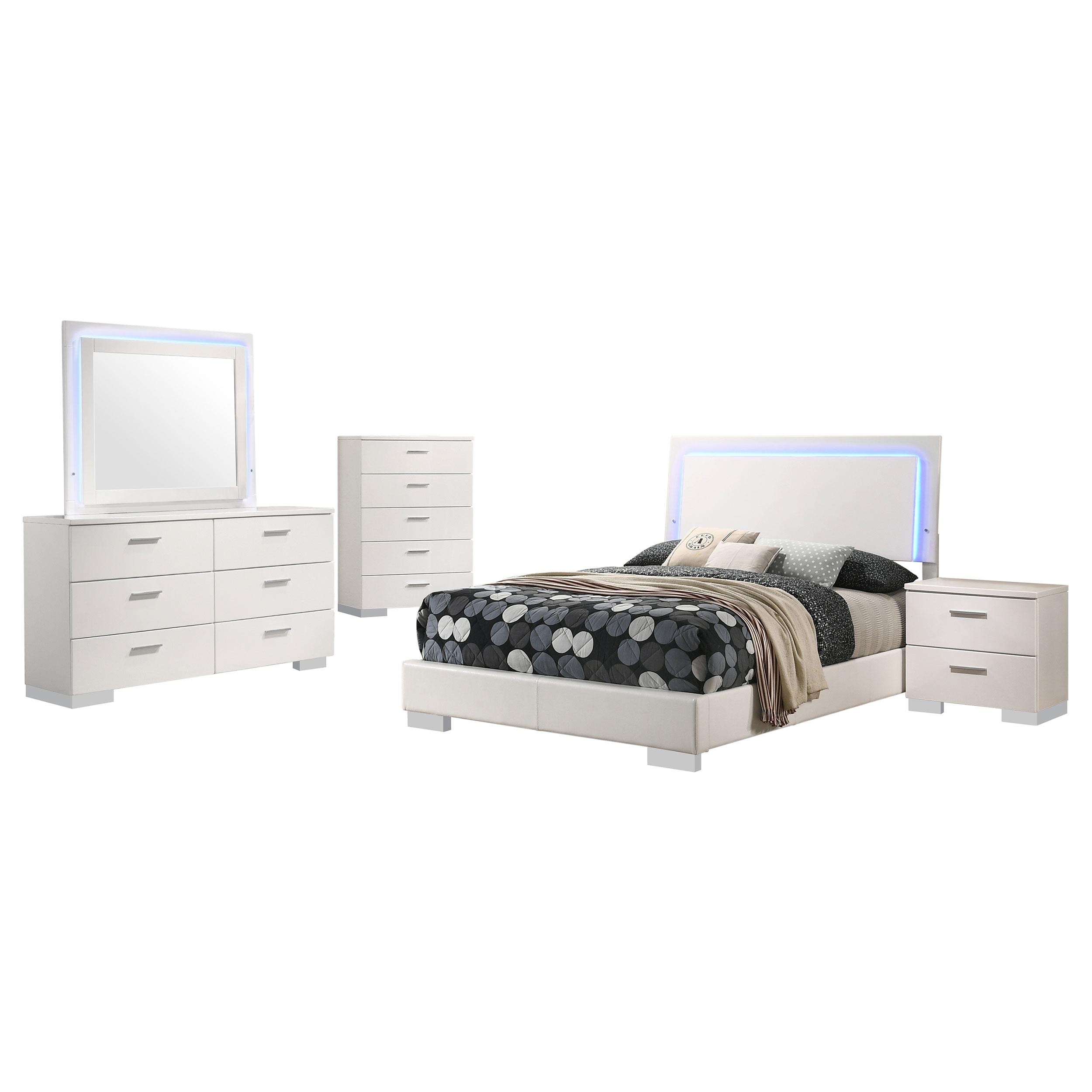 Sleek lines and integrated lighting define this contemporary bedroom set. The bed showcases a white high gloss headboard with built-in blue LED lighting, activated by a touch switch, and a faux leather upholstered frame for added refinement. Paired with a coordinating dresser mirror featuring perimeter LED lights and a touch sensor, the set balances utility with clean, modern design. Chrome hardware and smooth-glide drawers complete the polished look.