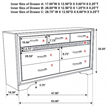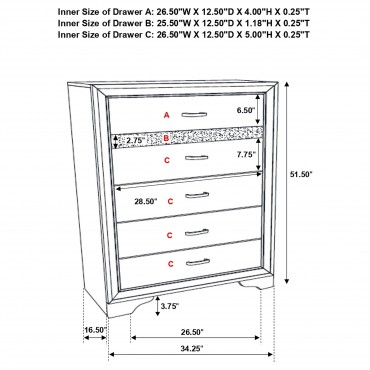 Sparkling trim brings the glamour of diamonds to this five-piece modern bedroom set. Designed to make a statement, it showcases a deep black finish with tuxedo inspired design elements that add glittering allure. The set centers on a chic bed, complete with an upholstered headboard and low footboard that create an airy, inviting pairing. The dresser, chest and nightstand each add ample storage, perfect for an organized bedroom ambiance. Each piece is complete with sparkling trim and jewelry inspired bar pulls on its drawer fronts that pull the look together perfectly.