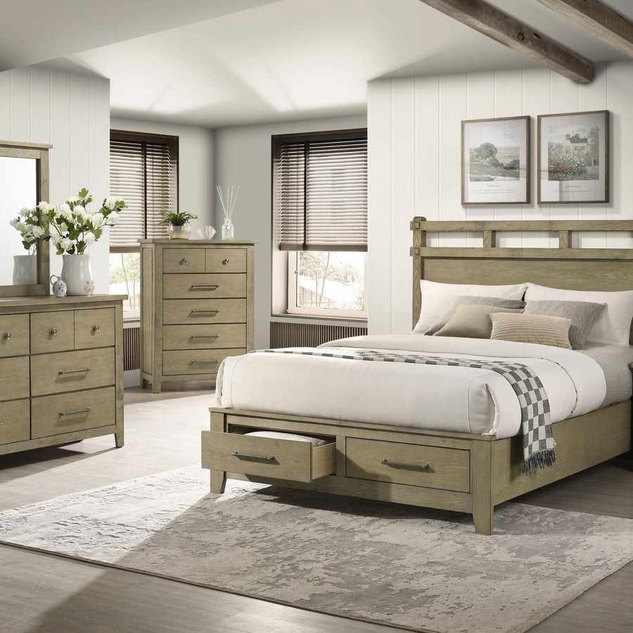 Elevate your space with this bedroom set blending craftsman character and modern utility. A vineyard oak finish enhances the oak grain texture across rubberwood and engineered wood veneer. Antique nickel metal knob and pull handles lend a refined touch to the clean, framed silhouettes. Case pieces glide with ease on heavy-duty metal ball bearing extension slides, while the platform bed features a framed headboard and two footboard drawers. Medium density fiberboard (Mdf) platform panels offer durable, foundation-free mattress support.