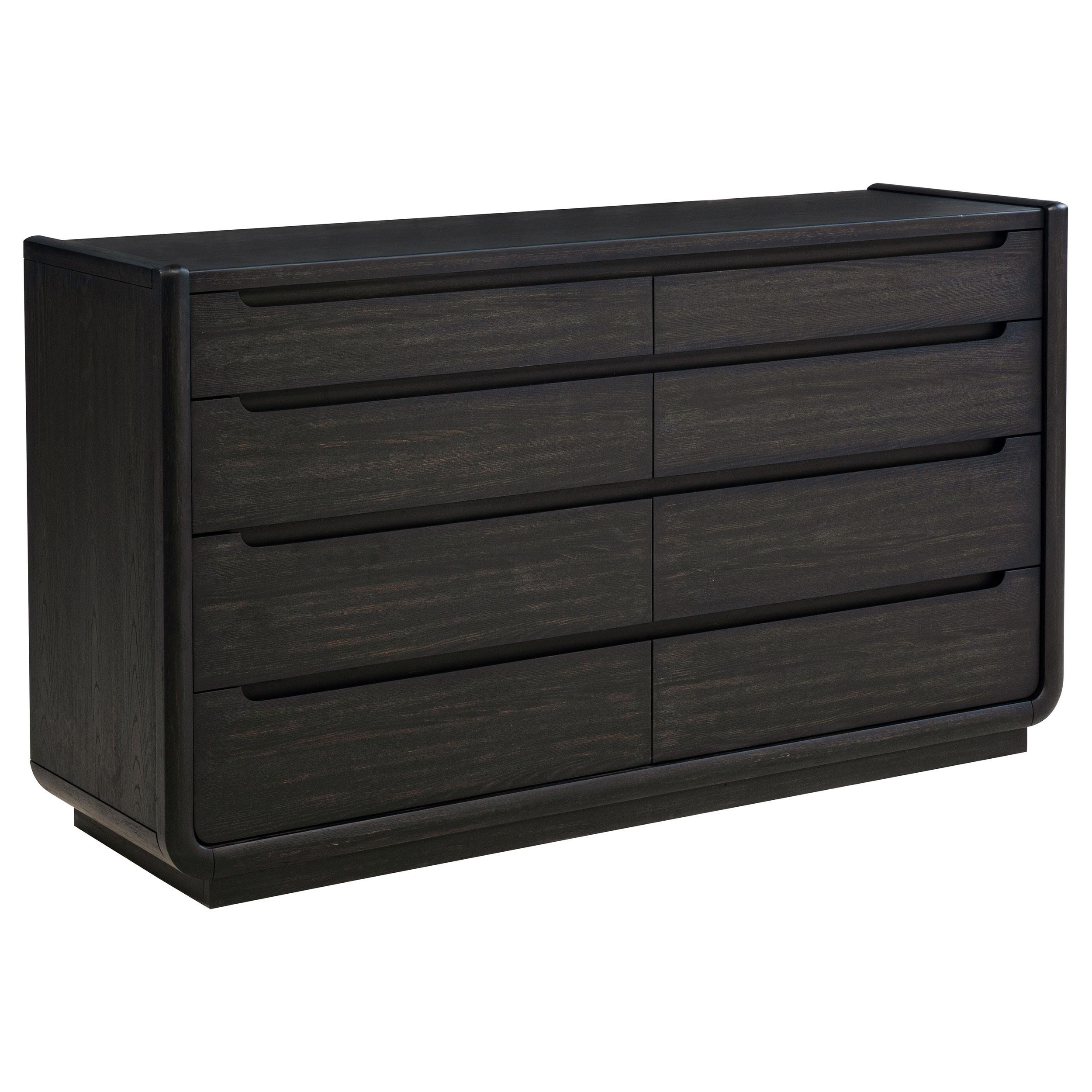 The Leandro bedroom set exudes quiet strength through softened forms and thoughtful materials. Anchored by a wingback bed with a cream upholstered headboard, the collection pairs sculptural silhouettes with a burnished black finish for moody depth. Each case piece features black felt-lined top drawers, English dovetail joinery, and soft-closing glides for enduring elegance. Dust panel construction and recessed pulls complete this study in modern simplicity and enduring comfort.