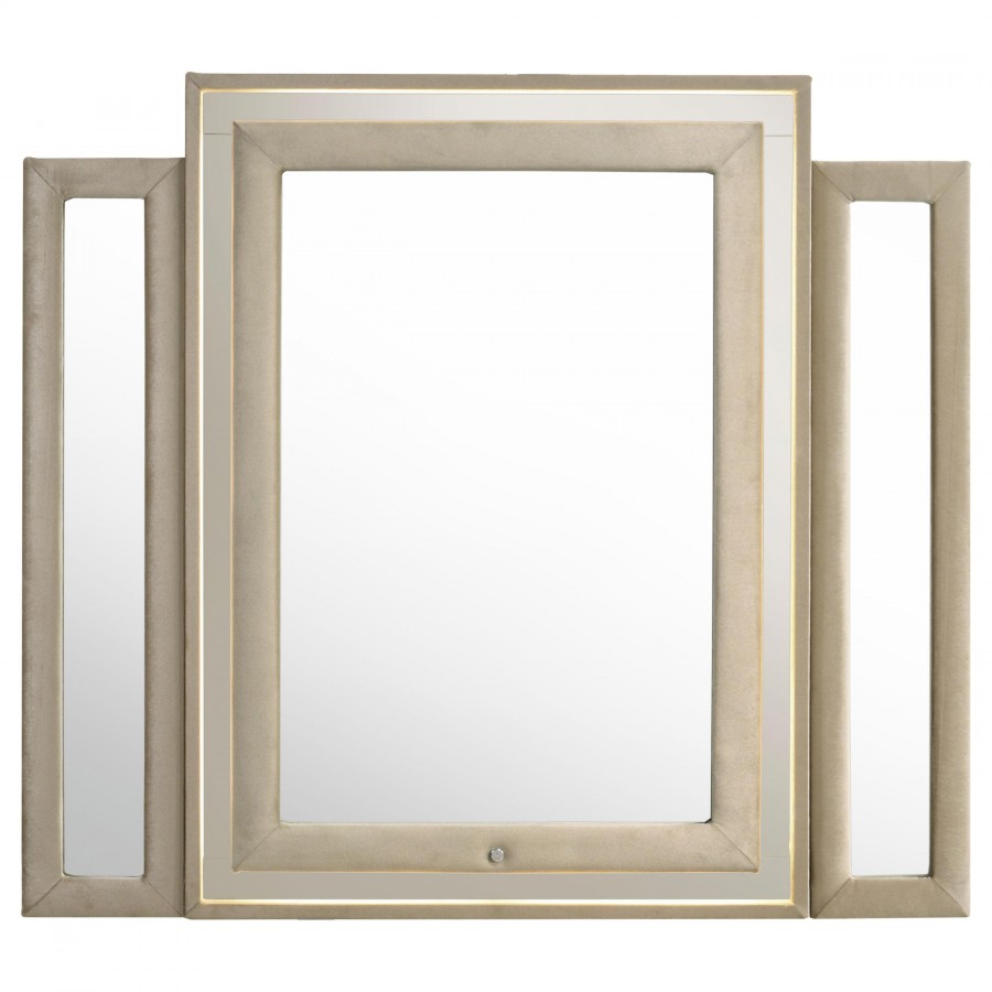 This bedroom set transforms everyday rest into a radiant retreat, blending plush textures with ambient light. Upholstered in ivory and camel velvet, each piece is trimmed in LED lighting for a soft glow. The dresser features a built-in flame visualizer with a clear tempered glass top and wireless remote. Paired with a tufted LED wingback bed, solid rubberwood legs nightstand with dual USB ports, and a light-framed mirror, the collection balances comfort with luminous elegance.