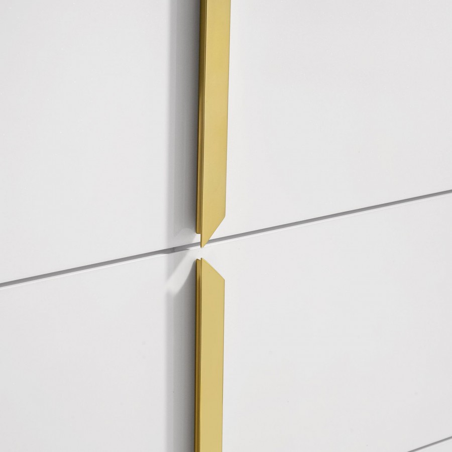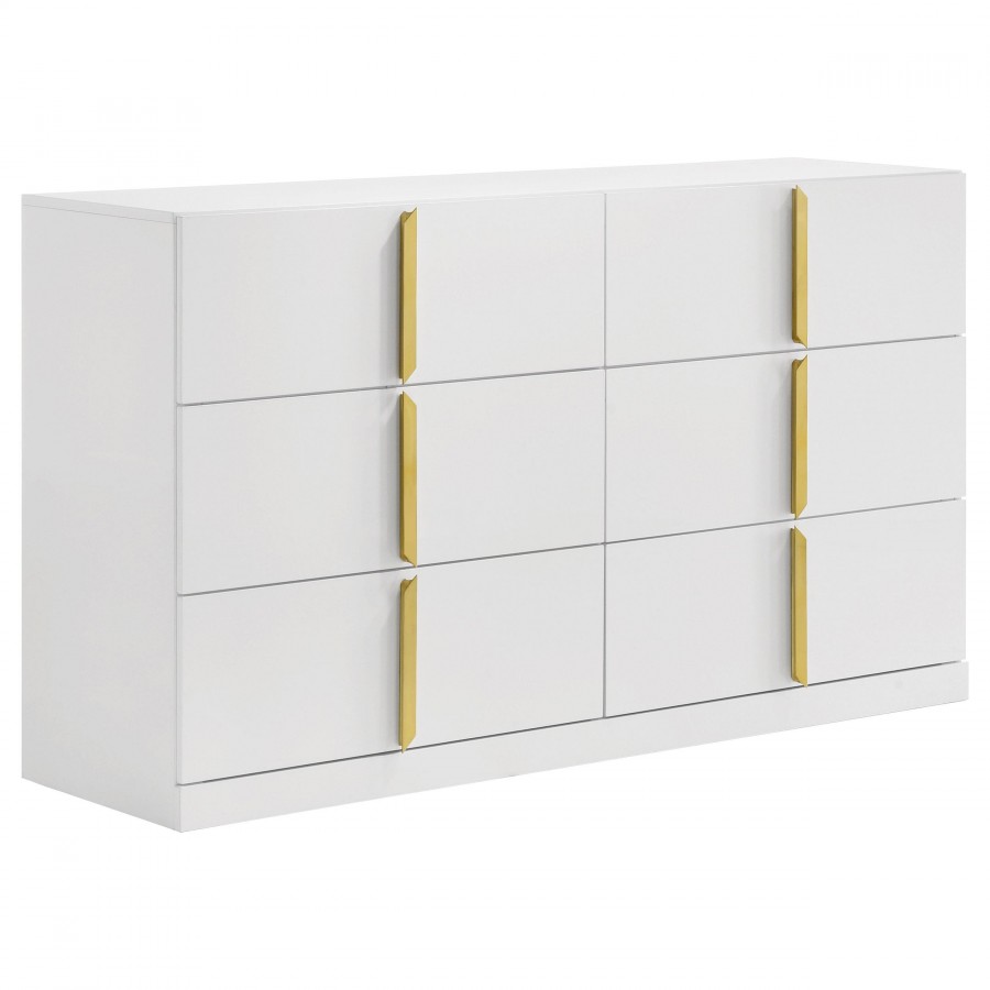 This contemporary bedroom set channels high-end Italian style through sleek geometry and luxe material finishes. Each piece is accented with polished gold details that bring sculptural contrast to clean, modern lines. Case goods are wrapped in eco-friendly PET thermoplastic for a glossy, durable, and easy-to-clean surface, while the bed features soft woven upholstery with bold gold acrylic trim. A refined blend of form, function, and everyday resilience.