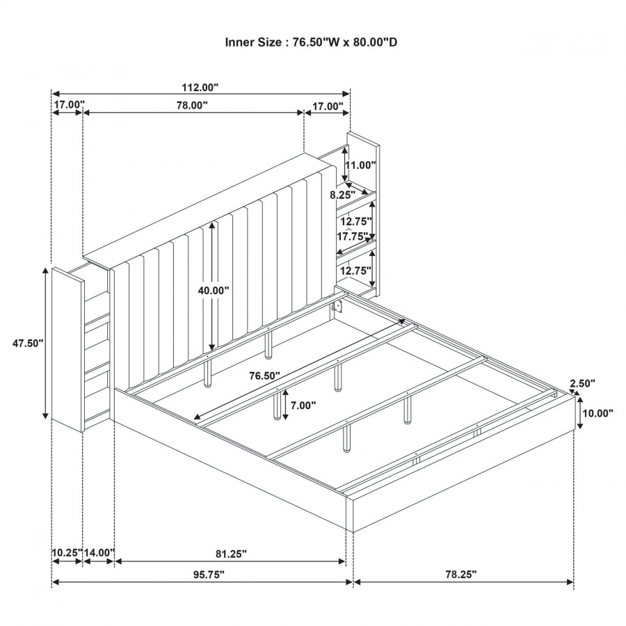 This bedroom set pairs quiet elegance with practical innovation. Finished in soft light oak, each piece features clean lines, antique nickel hardware, and thoughtful proportions. The bed includes a plush channel-tufted headboard framed by bookcase panels, each with three open shelves that glide outward on hidden casters. Built from engineered wood with a durable laminate veneer, this set blends tailored comfort and flexible storage with enduring quality.