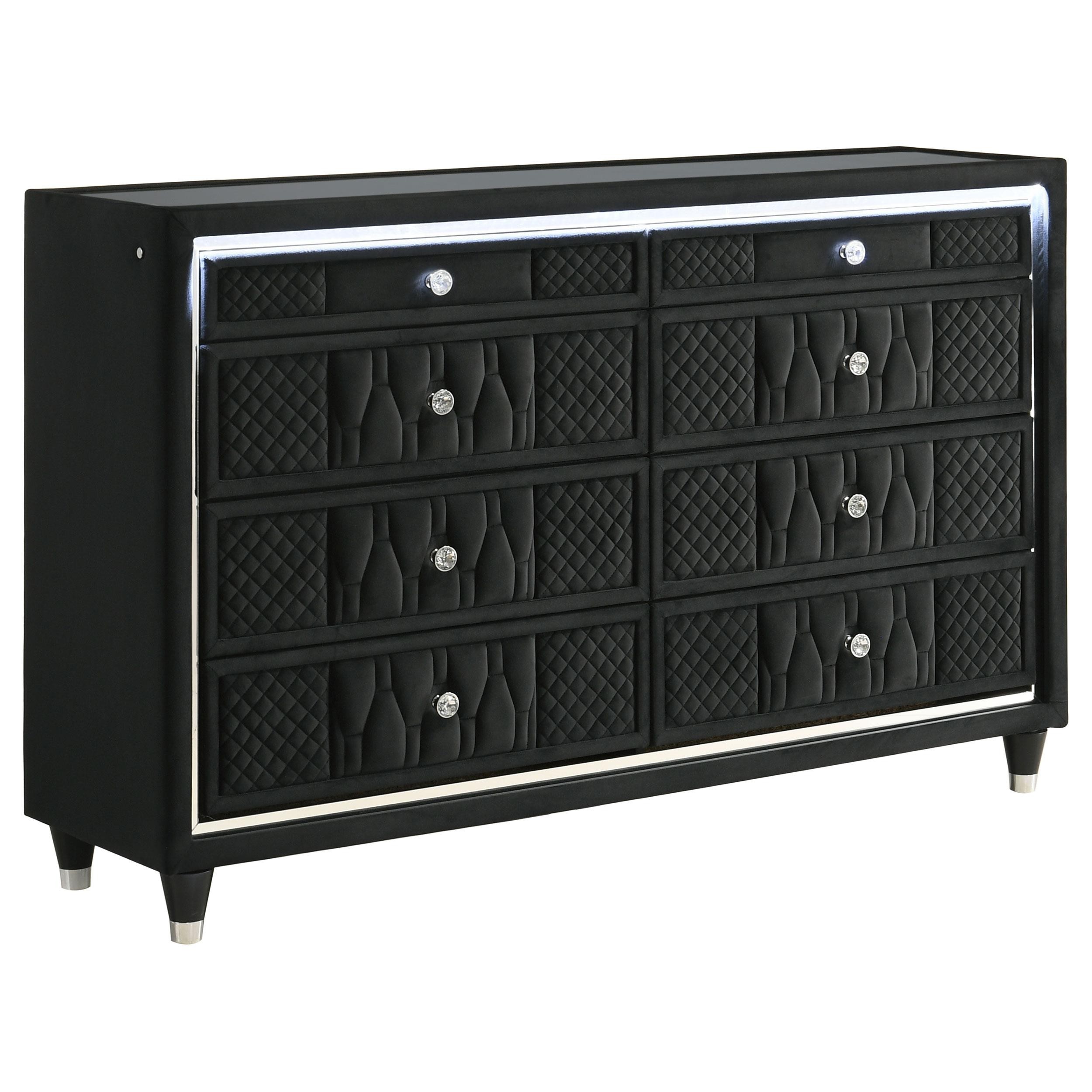 Unite form and function in this bedroom set, where sculpted glamour meets modern refinement. Each piece is wrapped in a black velvet with quilted textures, crystal knobs, and reflective acrylic accents. The dresser features a clear tempered glass top and LED case lighting without the fireplace insert. Combined with the LED wingback bed, USB nightstand, and tri-panel mirror, the set delivers soft sophistication with everyday practicality.