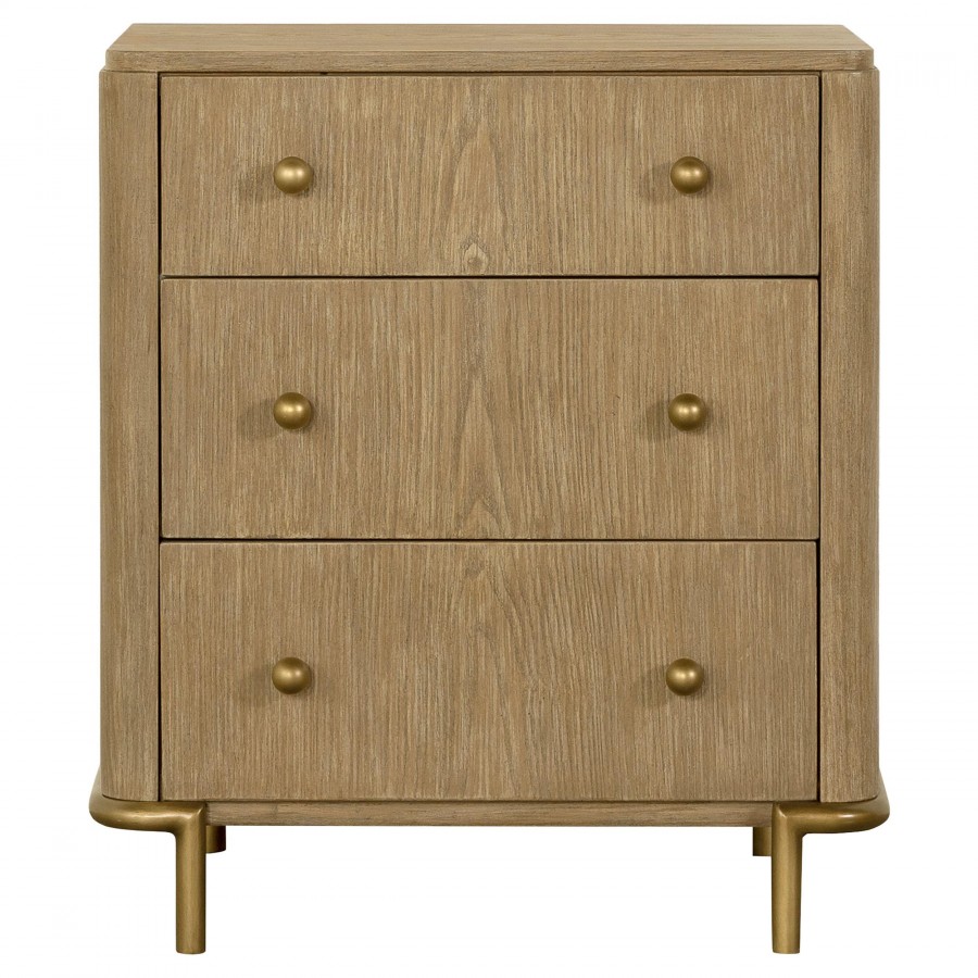 This coastal-inspired bedroom set blends mid-century modern influences with natural textures for a serene retreat. The bed features a cream fabric upholstered headboard and footboard, framed by a wire-brushed wood finish that enhances the beauty of rubberwood, engineered wood, and ash veneer. Aged brass knobs and slender metal legs provide a refined contrast. Designed for modern living, the nightstand includes a built-in dual USB charging port. With its organic textures and functional details, this set offers timeless style and everyday convenience.