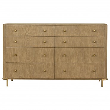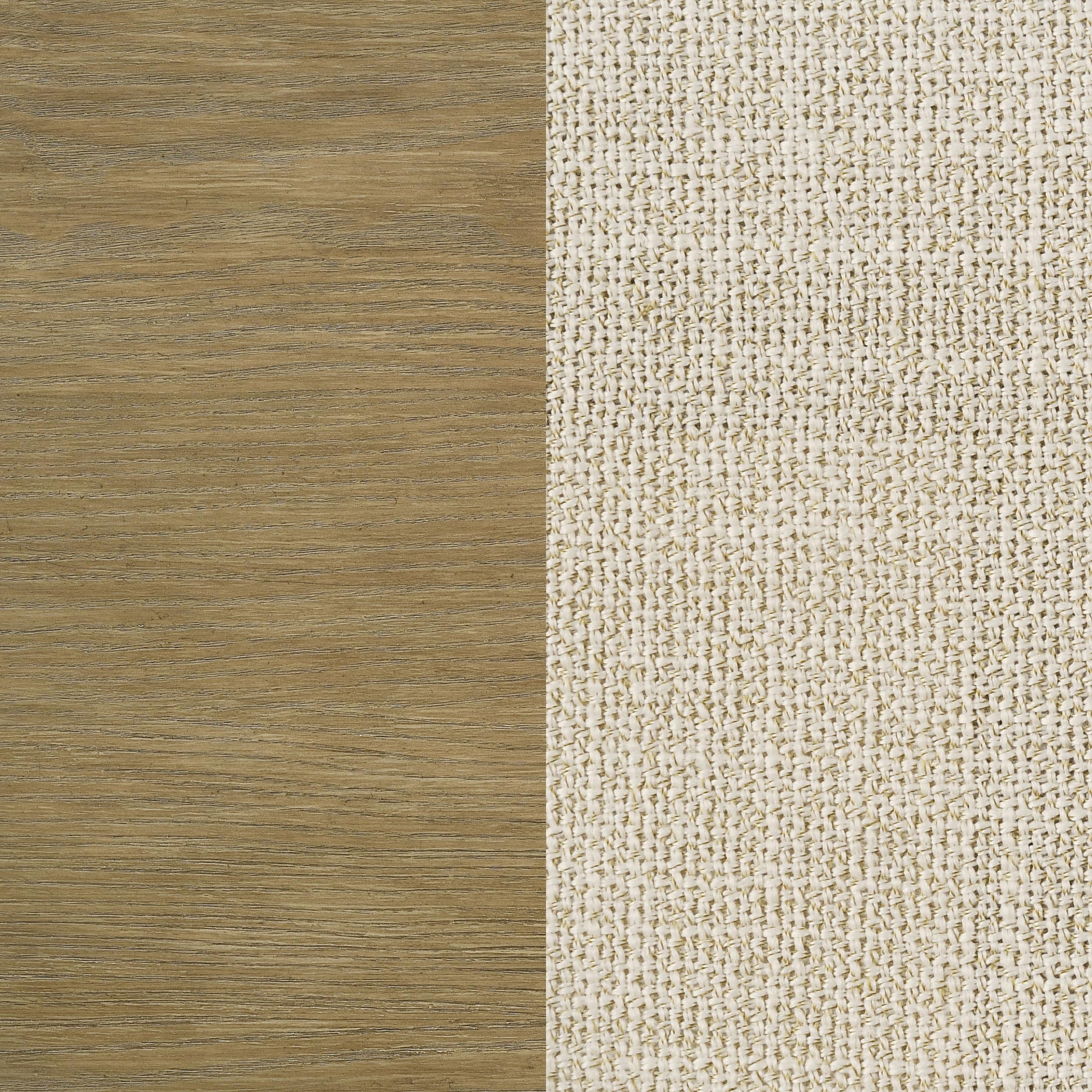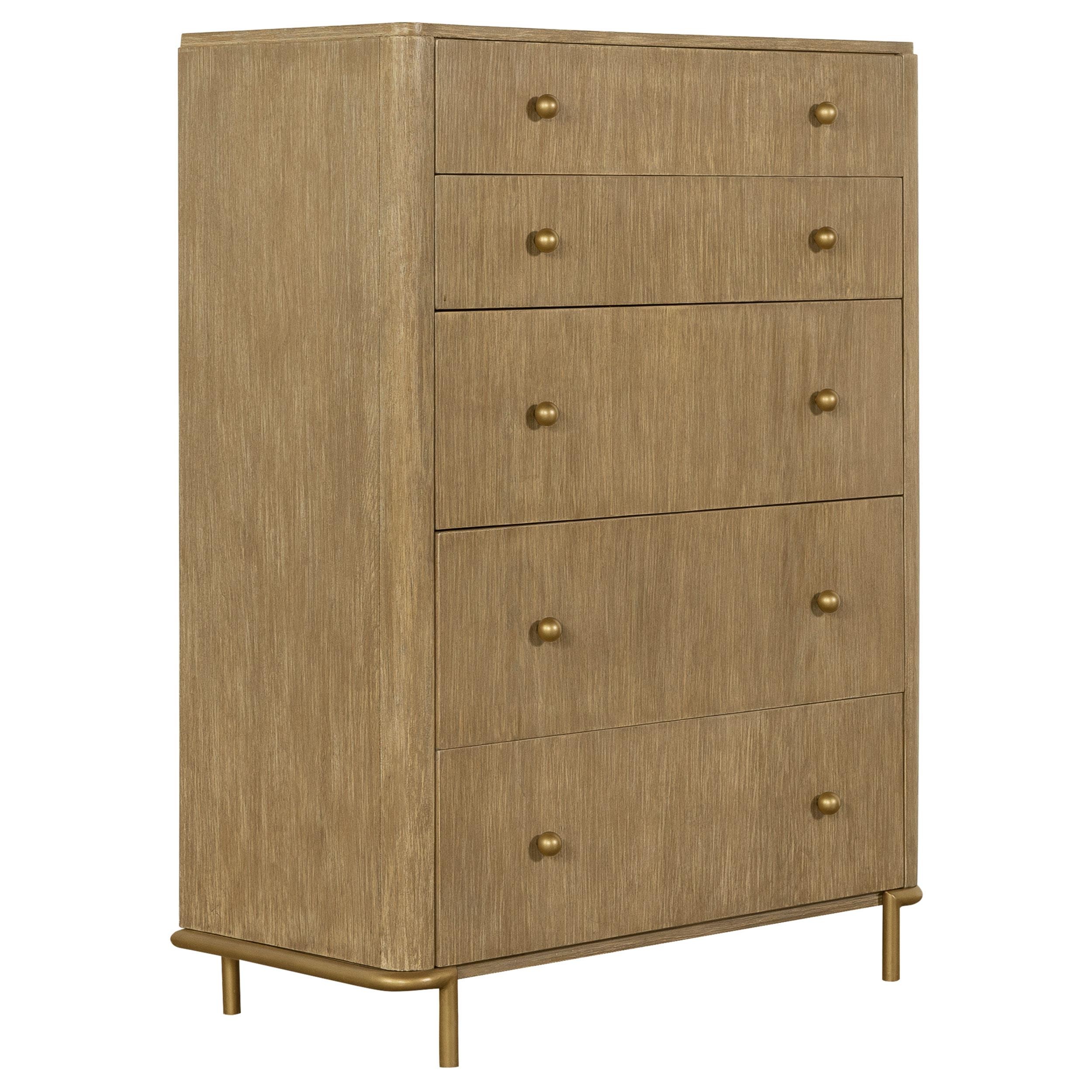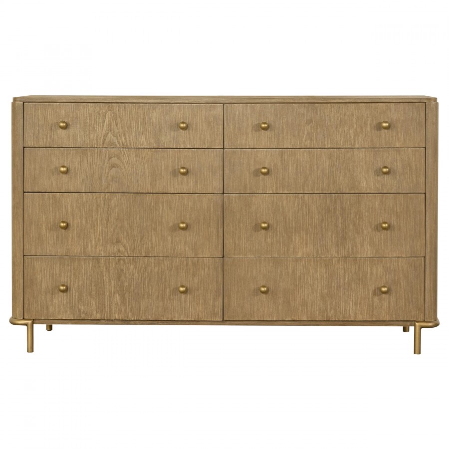 This coastal-inspired bedroom set blends mid-century modern influences with natural textures for a serene retreat. The bed features a cream fabric upholstered headboard and footboard, framed by a wire-brushed wood finish that enhances the beauty of rubberwood, engineered wood, and ash veneer. Aged brass knobs and slender metal legs provide a refined contrast. Designed for modern living, the nightstand includes a built-in dual USB charging port. With its organic textures and functional details, this set offers timeless style and everyday convenience.