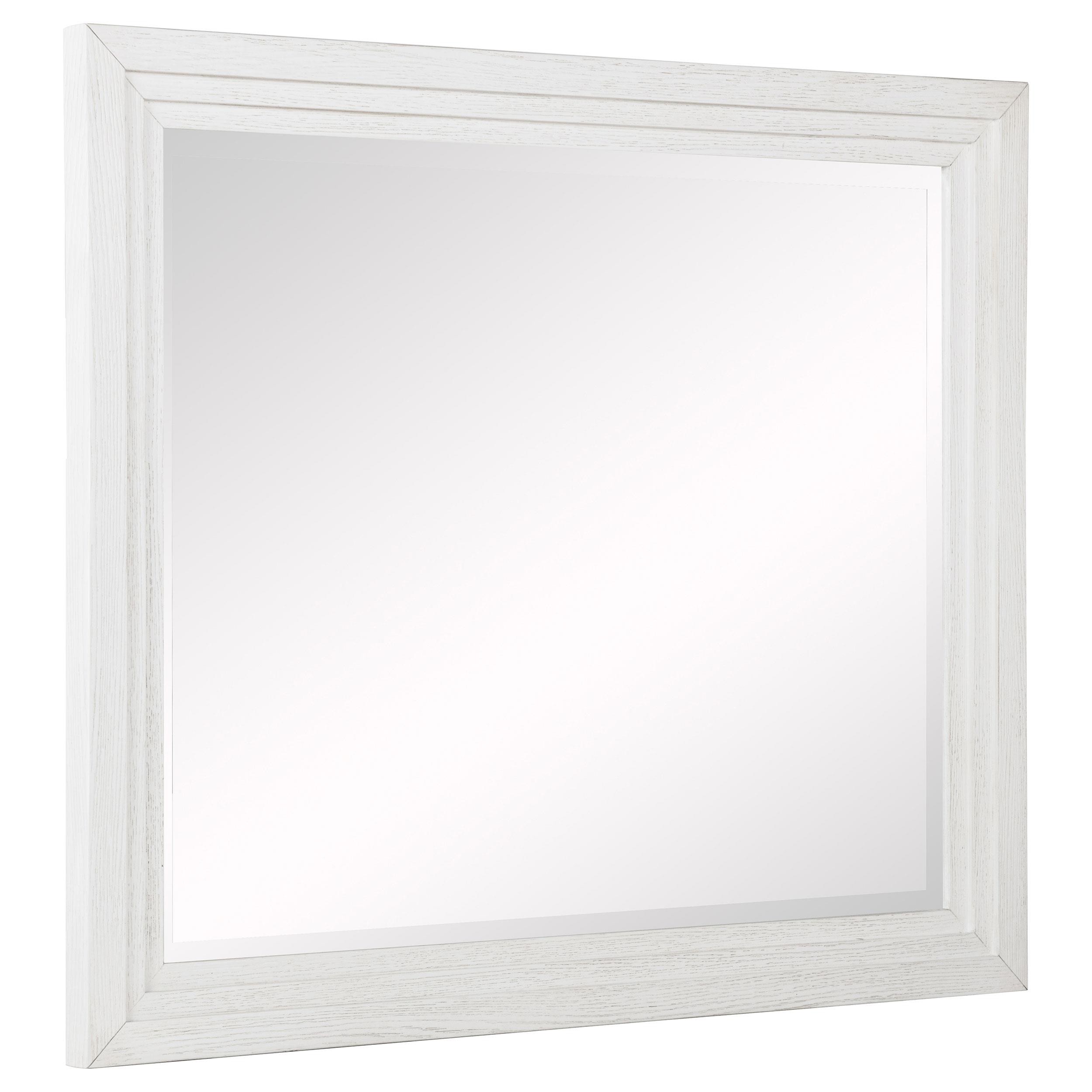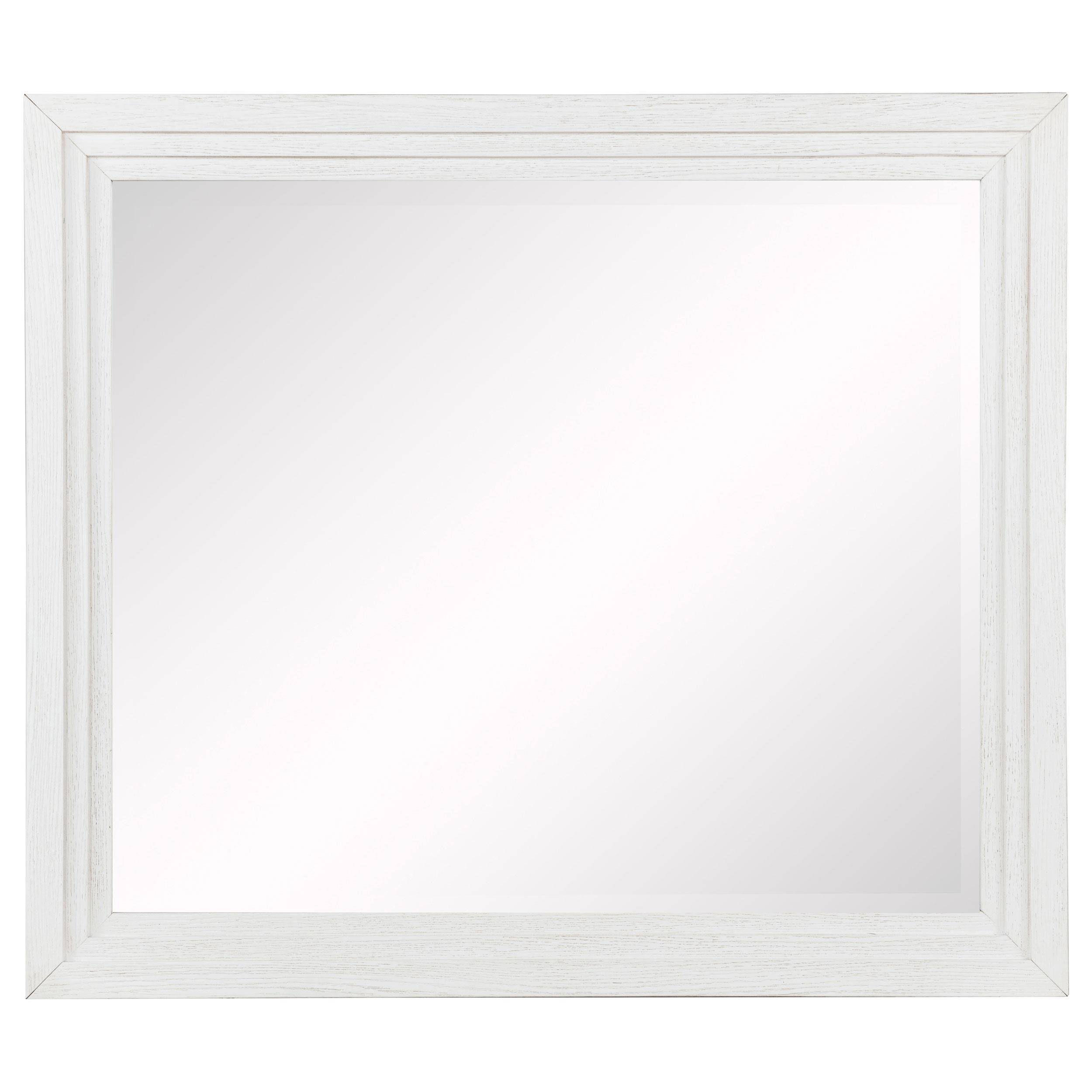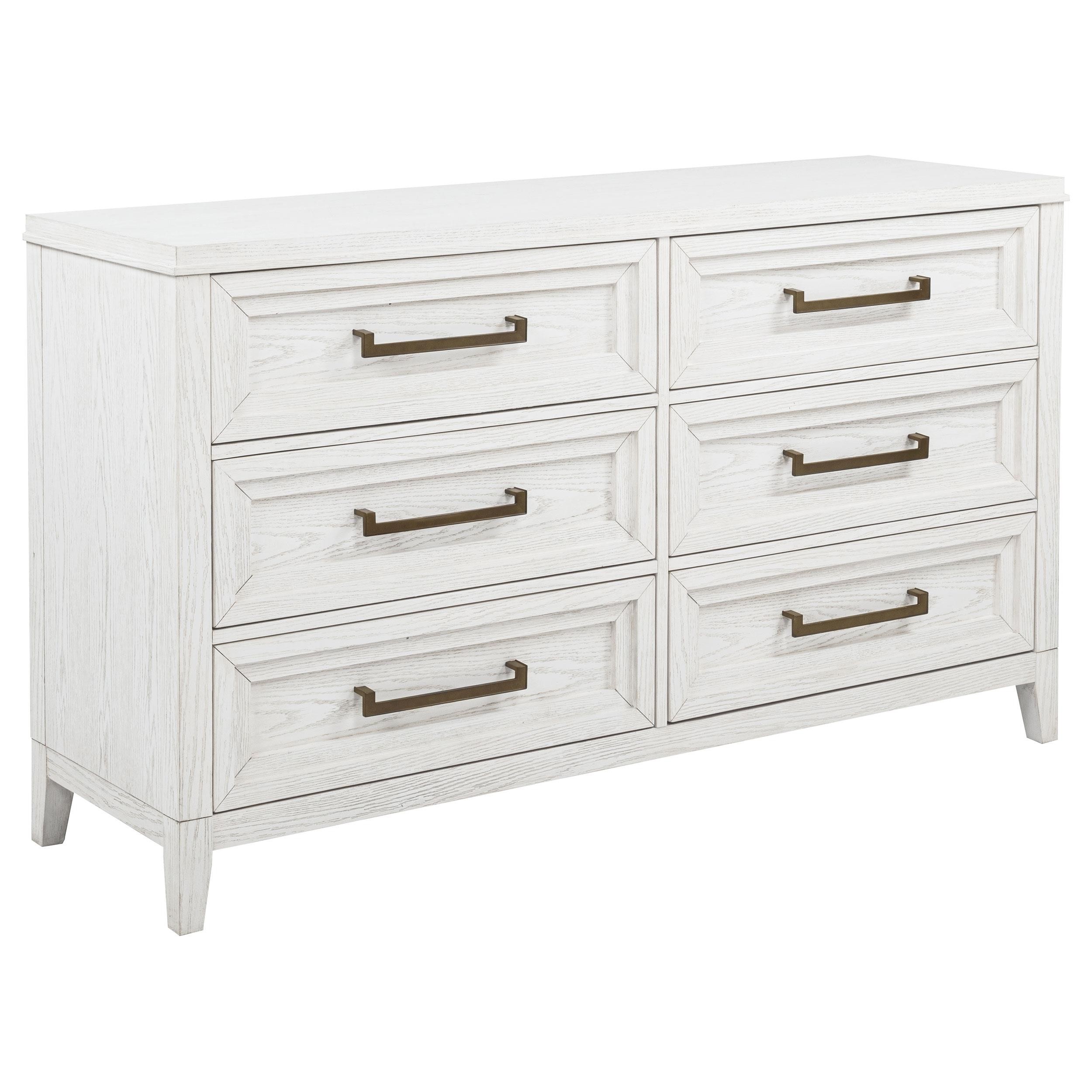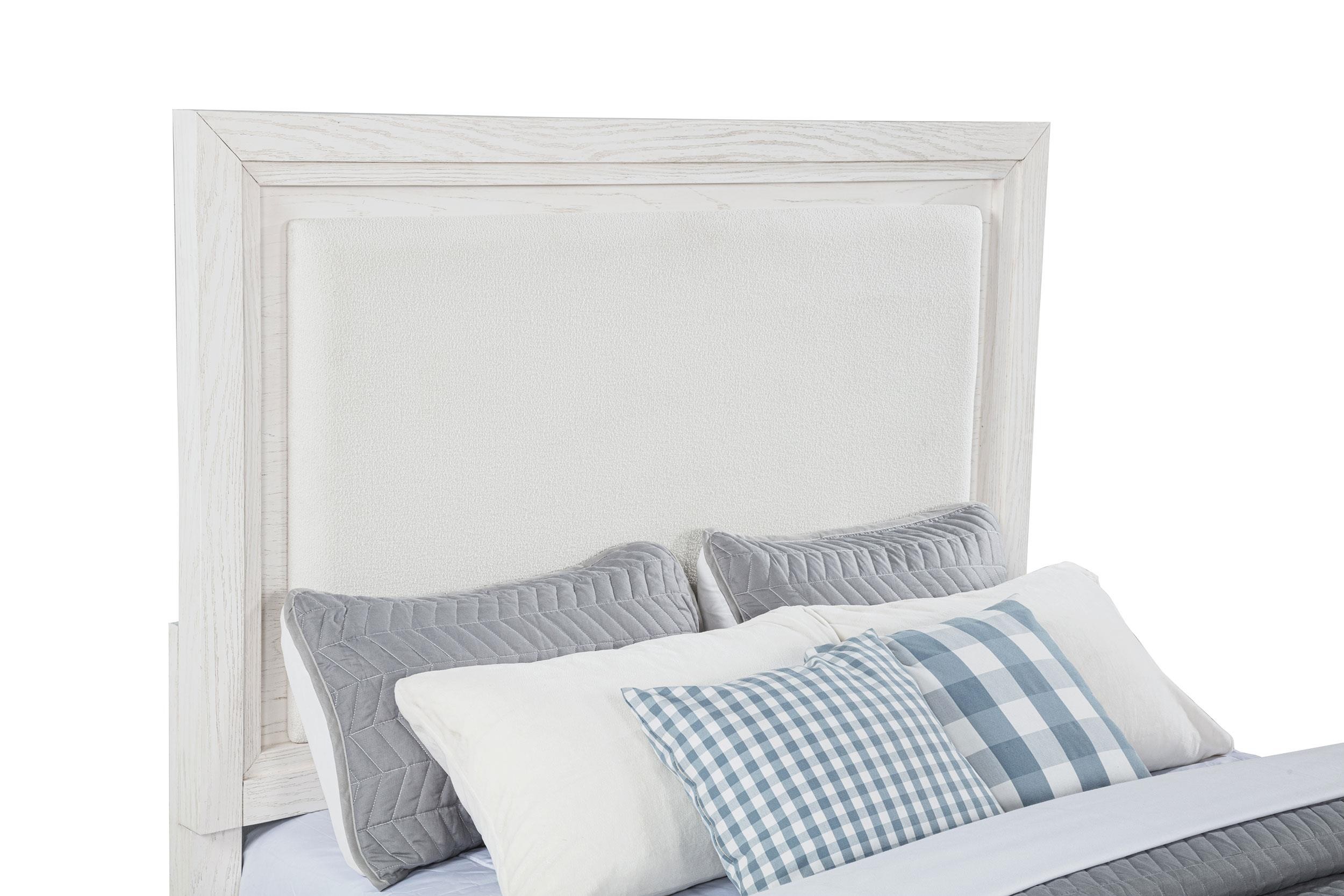 Distinctive hardware and layered trim work create a refined but dimensional effect for a five-piece modern bedroom set. In distressed white with wood grain texturing, it's a complete set that includes an upholstered bed with a padded headboard, two-drawer nightstand, five-drawer chest, and six-drawer dresser and mirror. It delivers ample storage and easy organization in a cohesive bedroom ensemble. The bed features a tall headboard and low footboard, offering a contemporary, open silhouette. Add colorful linens for a fresh look or stick with crisp white for a soothing monochromatic effect.
