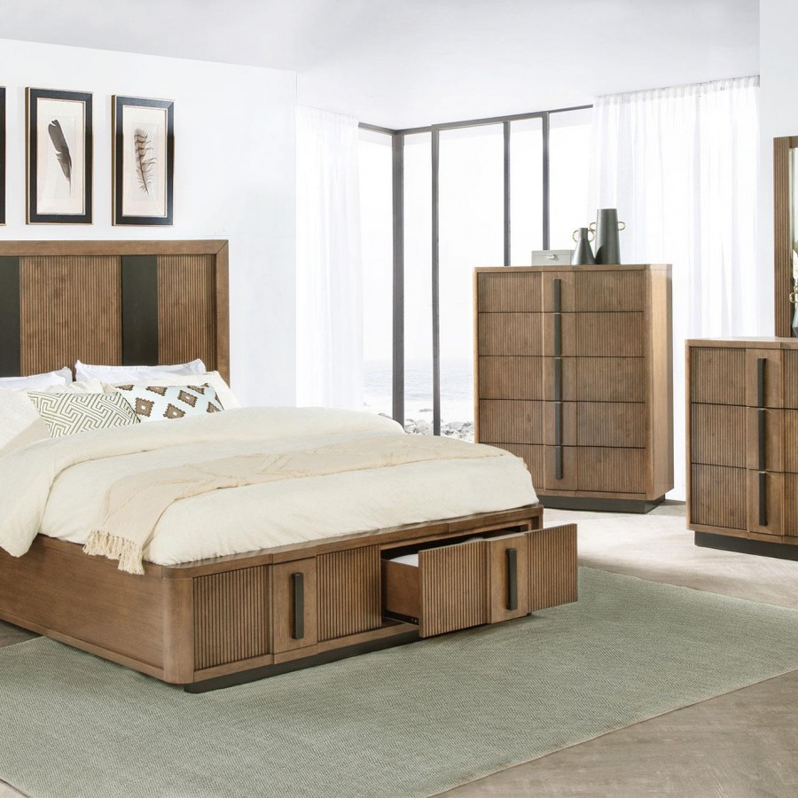 Enhance a handsome bedroom with the restrained sophistication of a modern bedroom set. The set delivers wooden construction and centers on a storage bed with a tall fluted headboard and low footboard with a pair of drawers for linens and accessories. Storage pieces add easy space for all your essentials and personal items. Each is adorned with vertical pulls that mimic the design of the bed's headboard, adding detail and dimensionality. The set offers fresh, refined style and personality, perfect for a soothing, relaxed bedroom retreat.