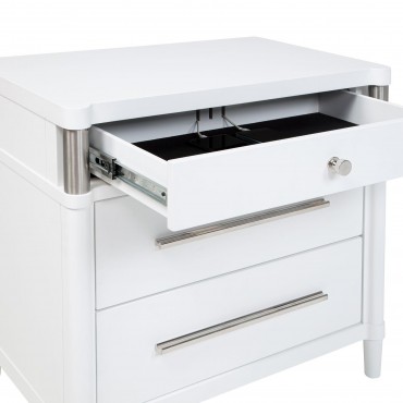 This bedroom set combines soft curvature and linear polish in a clean modern silhouette. Each piece features elongated brushed nickel pulls and subtle vertical tube accents that frame smooth white surfaces. The bed softens the look with a light grey upholstered headboard and footboard, adding contrast and comfort. Built from solid rubberwood, engineered wood, and laminate veneer, this set balances elegance with practical everyday function.