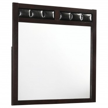 Create a refined retreat with this transitional bedroom set, pairing modern simplicity with timeless craftsmanship. The bed features channel-stitched black leatherette panels framed in a warm cappuccino finish, complemented by clean-lined storage pieces with brushed silver hardware. Each component is crafted from solid wood, veneer, and engineered wood for enduring strength. Blending style and function, this coordinated suite transforms the bedroom into a space of comfort and sophistication.