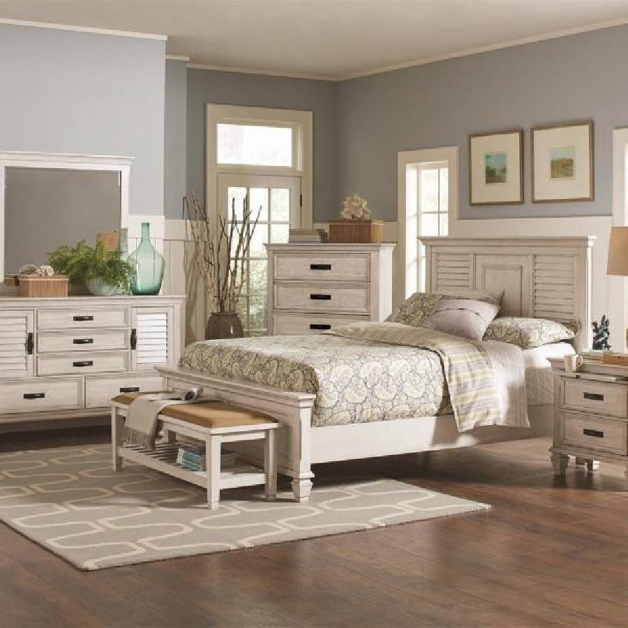 This magnificent 5-piece bedroom set from the Franco collection has chic styling and modern convenience. The imposing headboard and low footboard of the bed are crafted with detailed panels for an elegant look. The durable, roomy drawers on the nightstand, chest, and dresser are conveniently built with soft-closing guides. A handy pull-out service tray is built into the nightstand and includes easy cord access for recharging your gadgets. A large rectangular mirror that easily sits atop the dresser rounds out the set, each piece of which features a handsome finish that adds a rustic ambiance to the bedroom.