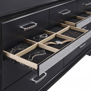 Create the bedroom of your dreams with this elegant, five-piece furniture set. Complete with a bed, nightstand, dresser, mirror and chest, it has all you need to complete your space. Each case piece includes a hidden jewelry drawer to keep valuables safe and secure. The two additional drawers built into the bed are ideal for storing shoes, bedding, clothing, and more. Each piece in this set is finished in a solid color for an appealing, monochromatic look.