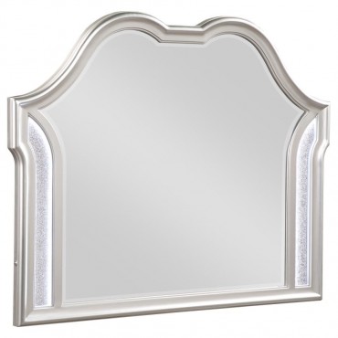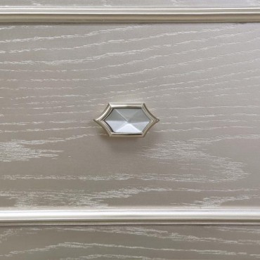 This elegant, glam bedroom set boasts a beautiful double arch platform bed and matching three-drawer nightstand, nine-drawer dresser, vanity mirror, and five-drawer chest to create your breathtaking bedroom retreat. Padded inserts with curved channel tufting upholstered in a soft, ivory fabric adorn the headboard and footboard of the bed, as glittering accent panels offer a luxurious touch throughout the gleaming silver oak finish. The dresser, nightstand, and chest offer ample storage with spacious drawers, each fastened with hexagonal-shaped knobs and bail drop pulls that make it easy to grab items. Soft grey felt-lined top drawers and a USB port on the nightstand offer modern conveniences. A smooth beveled mirror with a double arch frame that reflects the bed silhouette offers a finishing touch and brings this sophisticated glam bedroom set together.