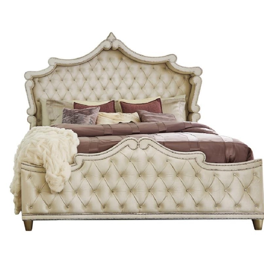 A traditional and modern bedroom set meets all expectations for an incredible impact in your sleeping space. Smooth and soft upholstered enhances each piece in this set. Coming in a camel and ivory color, this set is inspired by French Provincial decor. Crystal-like accents make their presence known within the button tufting. Gorgeous nailhead trim adds the finishing touch on this upholstered bedroom set.