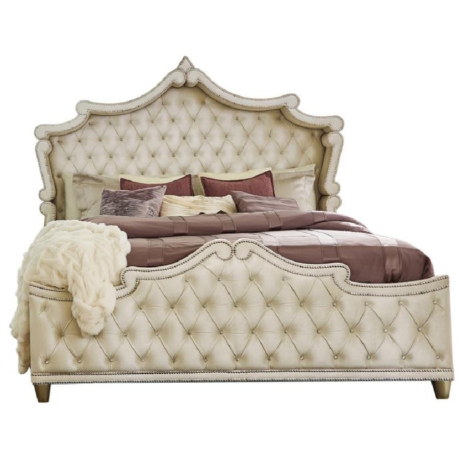A traditional and modern bedroom set meets all expectations for an incredible impact in your sleeping space. Smooth and soft upholstered enhances each piece in this set. Coming in a camel and ivory color, this set is inspired by French Provincial decor. Crystal-like accents make their presence known within the button tufting. Gorgeous nailhead trim adds the finishing touch on this upholstered bedroom set.