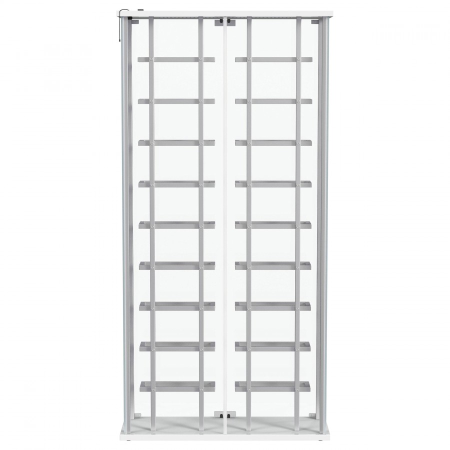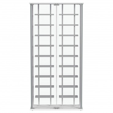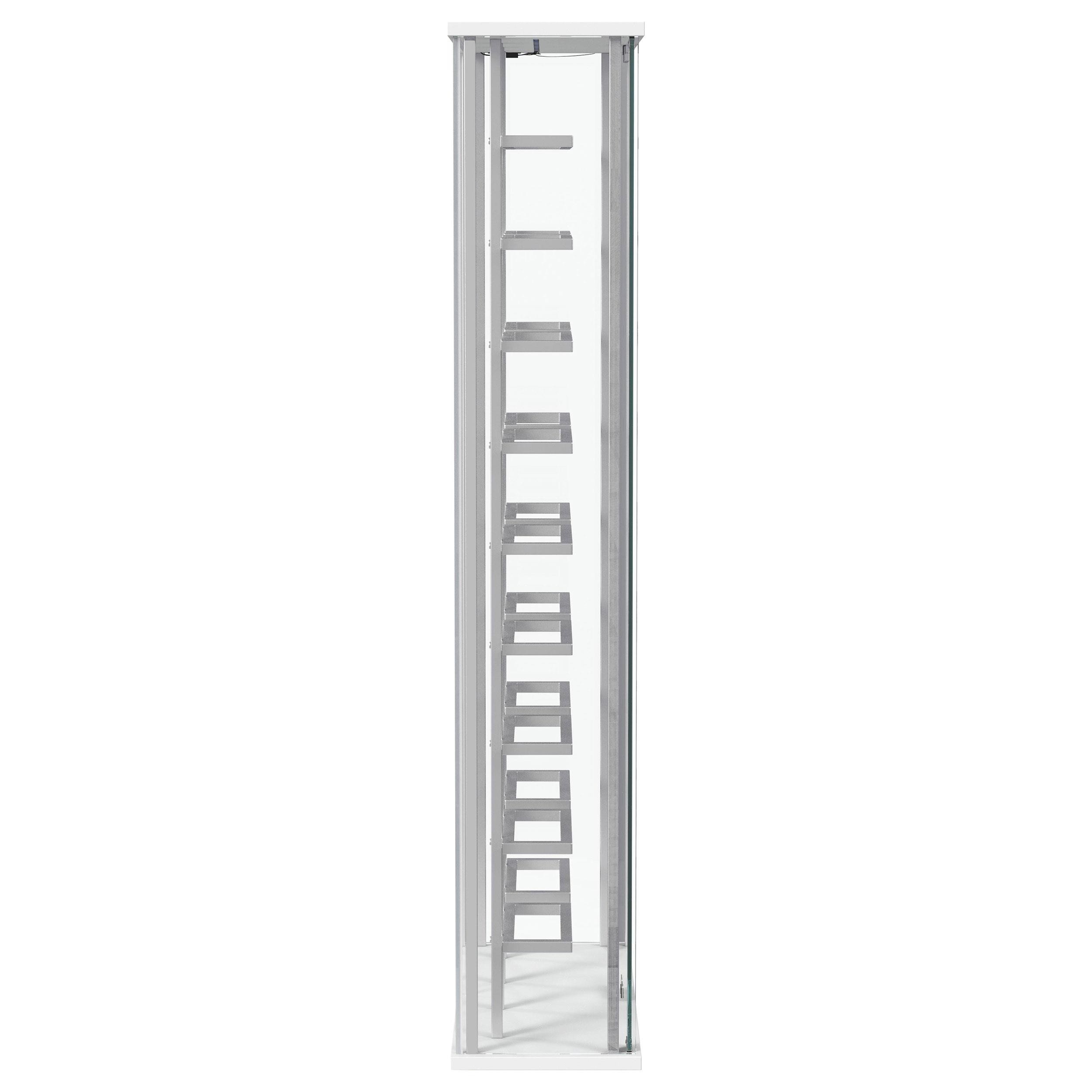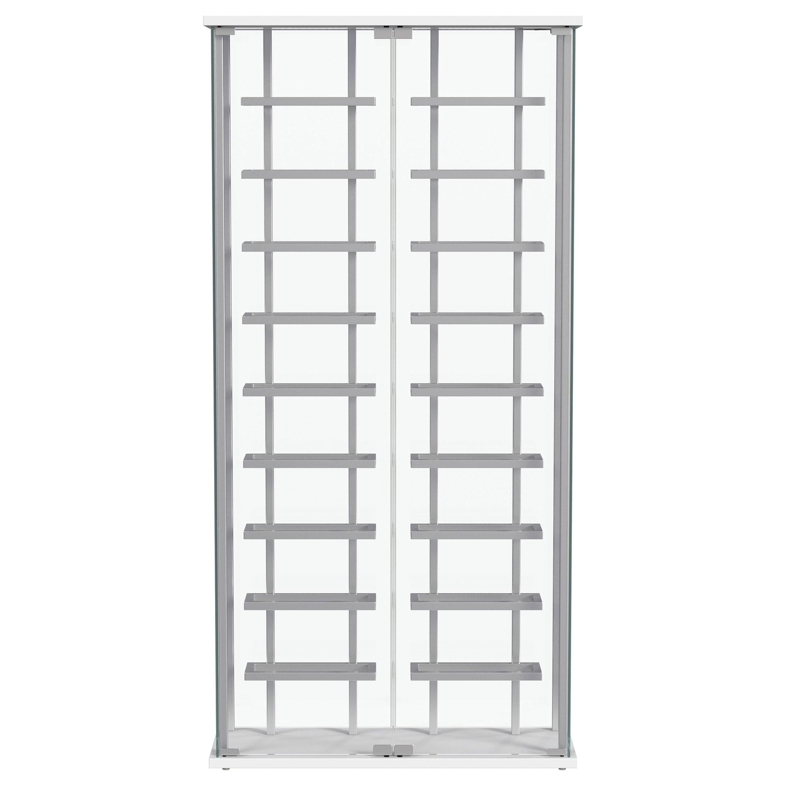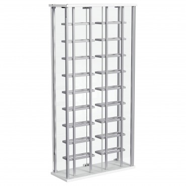 Put the spotlight - literally - on your favorite vintages with a modern bar cabinet. The glass cabinet is crystal clear with built-in LED lighting, offering bright, open flair in your dining room or home lounge. The cabinet features two glass doors with chrome hardware, offering a matching look to interior shelving. Shelves hold up to 18 of your favorite bottles of wine, showing them off to their best effect. The LED light is operated with a touch switch, making it simple and easy to highlight prized vintages.