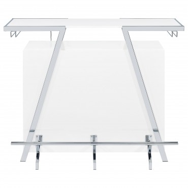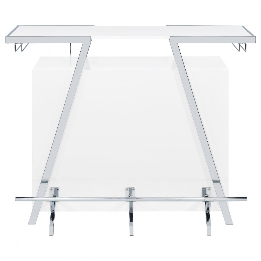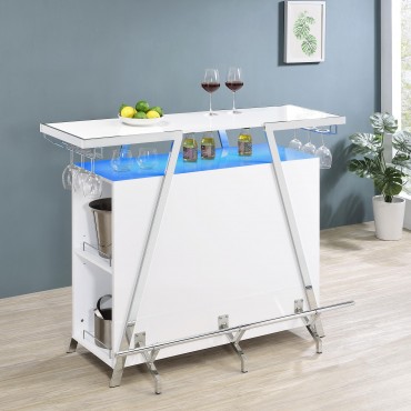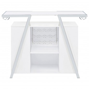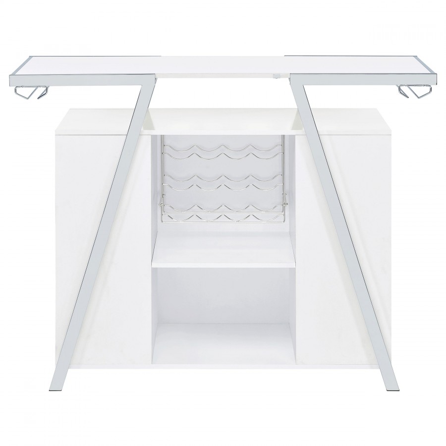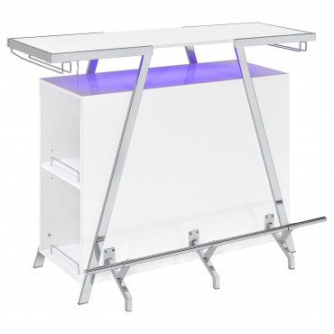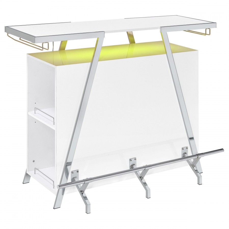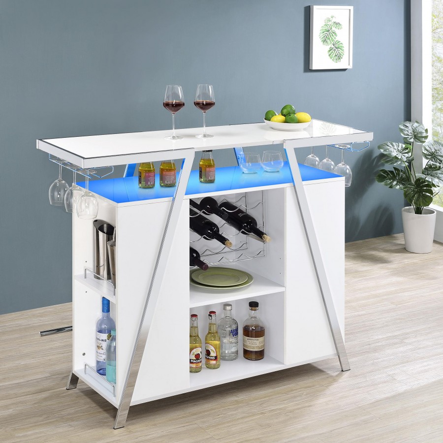 Pull out all the stops to breathe fresh energy and organization into a casual space dedicated to entertainment. Your needs are met with this modular-inspired and contemporary home bar constructed of MDF, paper coating, and veneer, all with a bright white finish. Metal framing is jazzy with a geometric motif, supporting a spacious top shelf ideal for beverage and snack prep. A center compartment features shelving and bottle racks, while the integrated LED strip located on the underside of the table top can change color. This handy bar unit transforms a compact space into a modern home-based venue for fun.