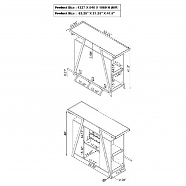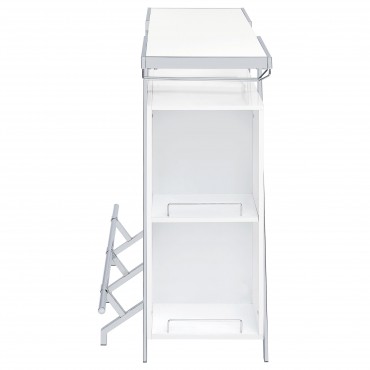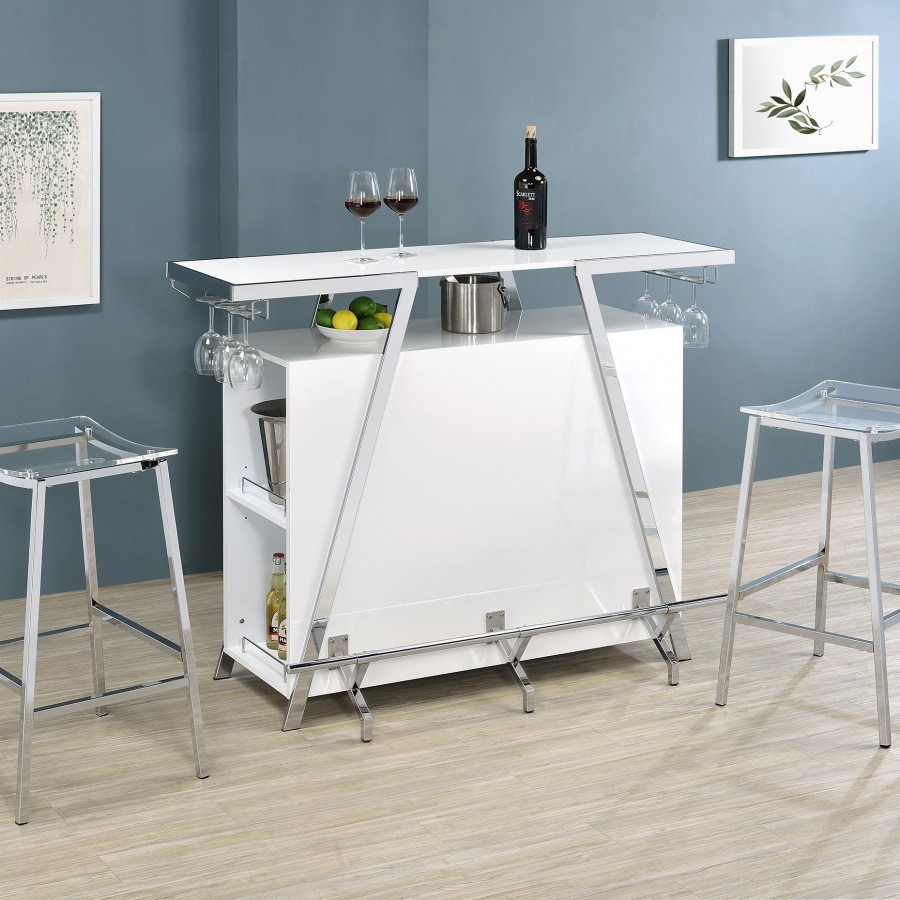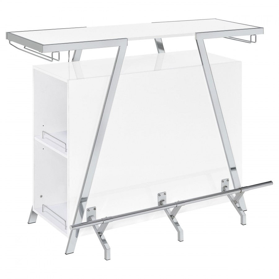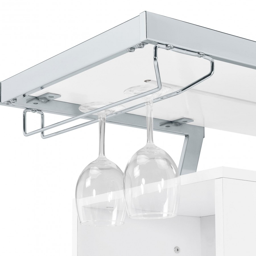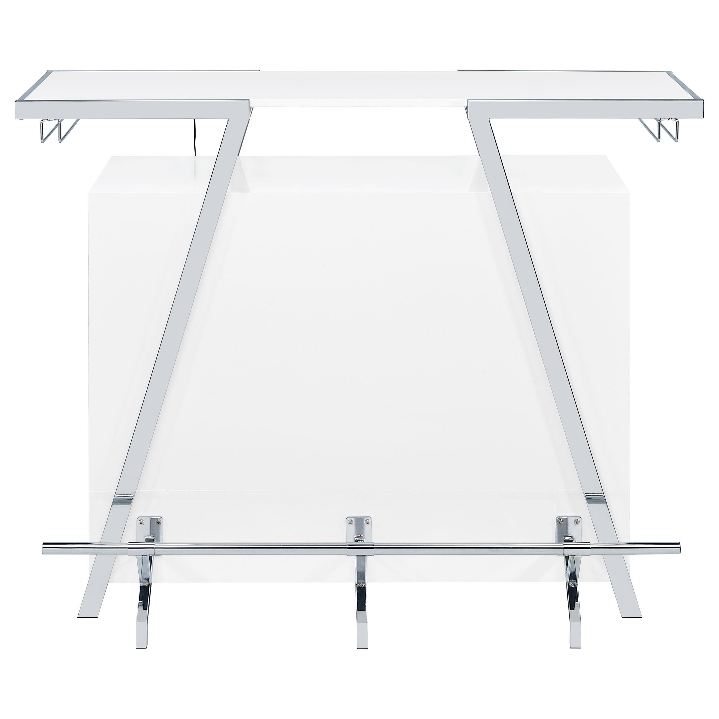 Pull out all the stops to breathe fresh energy and organization into a casual space dedicated to entertainment. Your needs are met with this modular-inspired and contemporary home bar constructed of MDF, paper coating, and veneer, all with a bright white finish. Metal framing is jazzy with a geometric motif, supporting a spacious top shelf ideal for beverage and snack prep. A center compartment features shelving and bottle racks, while the integrated LED strip located on the underside of the table top can change color. This handy bar unit transforms a compact space into a modern home-based venue for fun.