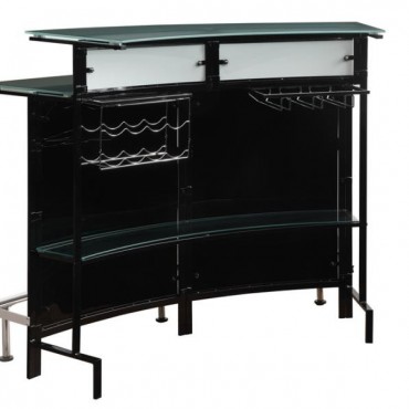 Entertain in sleek sophistication with this modern home bar, featuring a curved silhouette, chrome accents, and glossy black and white acrylic panels. Dual-tiered frosted glass tops offer ample space for mixing and serving, while the metal footrest invites guests to sit back and enjoy the experience. Designed to impress in any lounge or entertaining space.