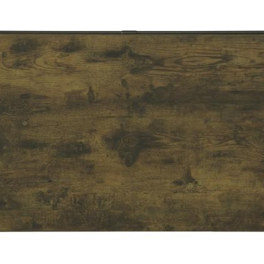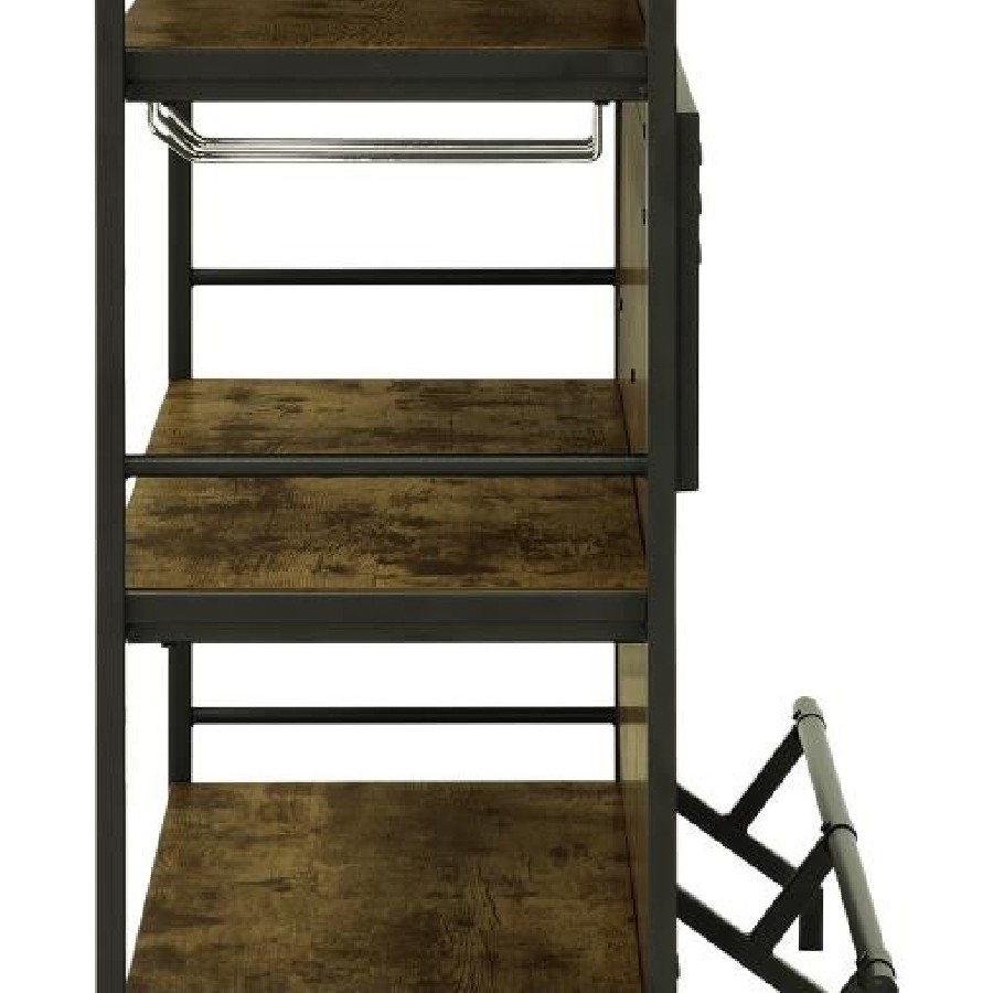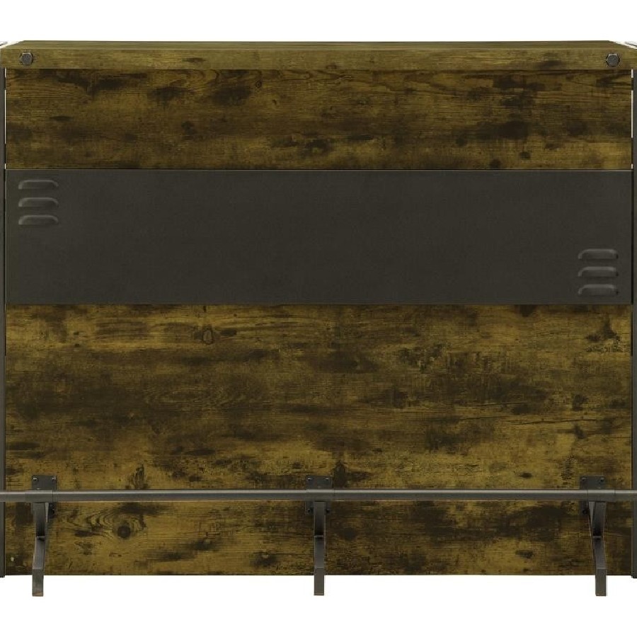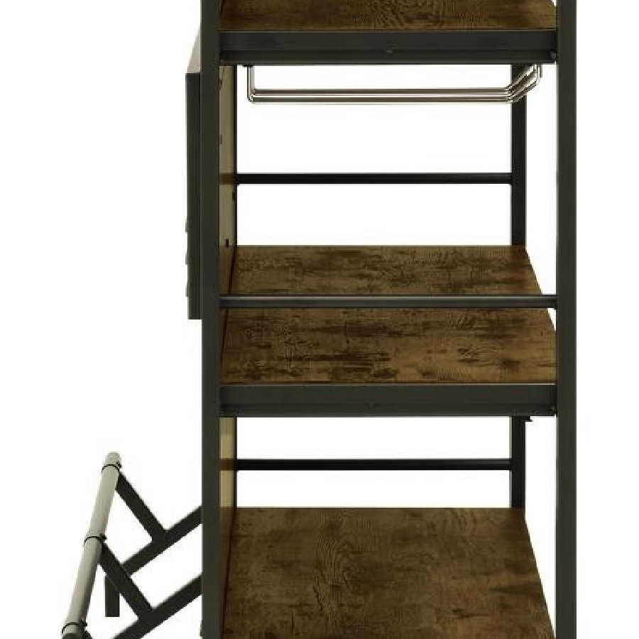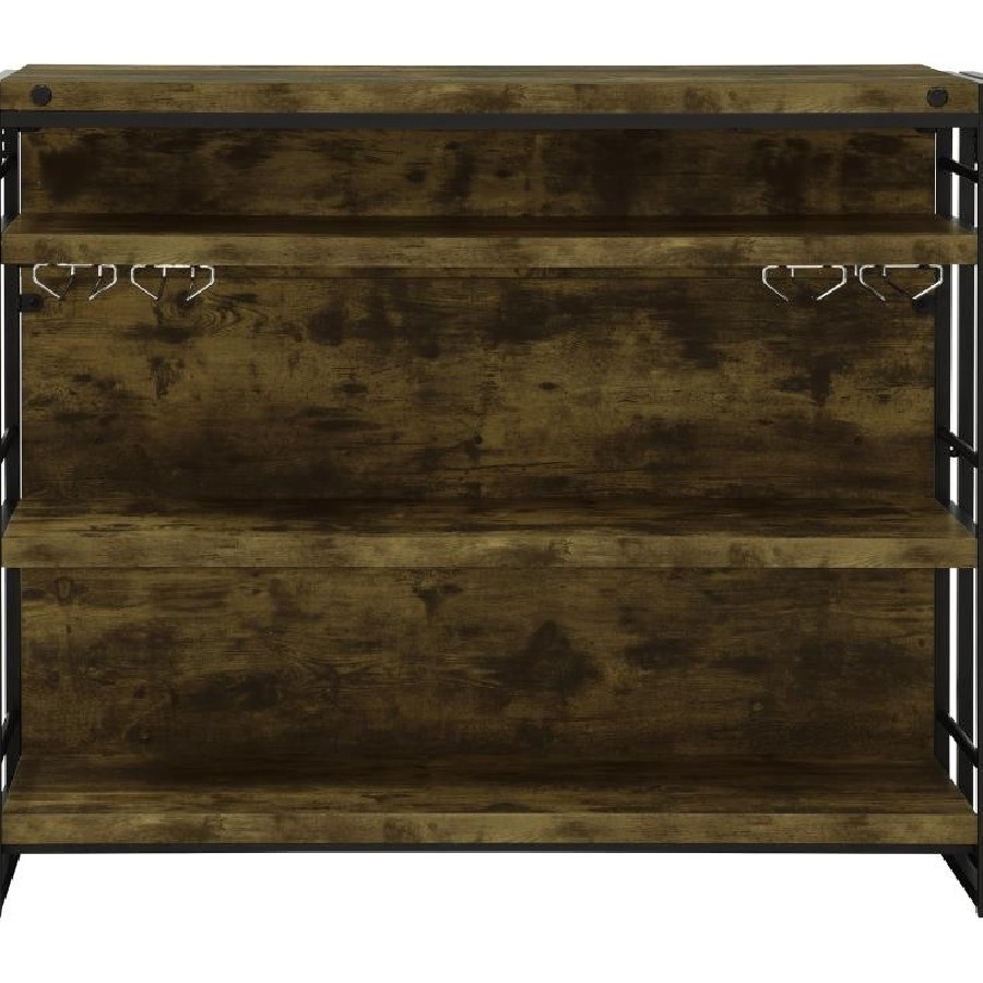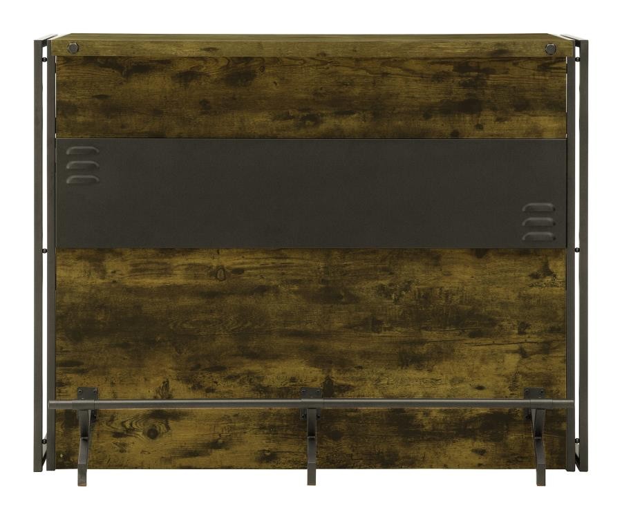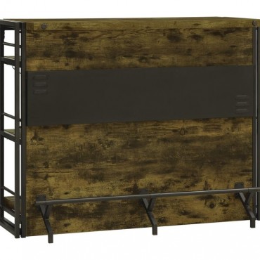 This home bar offers a stylish and functional centerpiece for entertaining guests. Designed with a rustic nutmeg wood-look laminate, it brings a warm, inviting feel to any space. A sturdy dark bronze powder-coated metal frame enhances durability while adding an industrial touch. Three tiers of shelving provide ample storage for bottles and accessories, while four rows of stemware racks keep glassware conveniently within reach. The built-in footrest ensures comfort for guests seated at the bar.